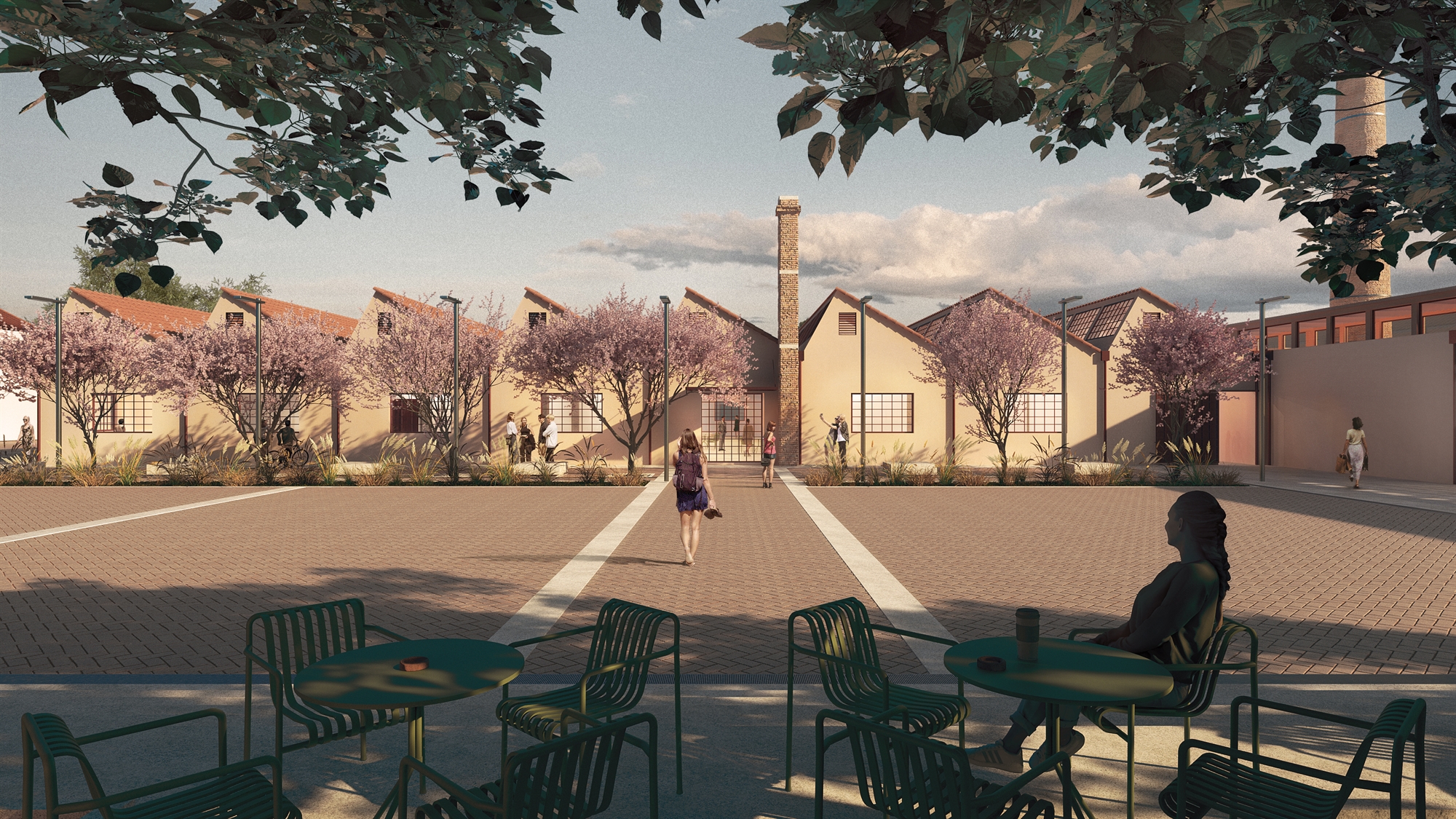 Στη σκιά της εμβληματικής 38μετρης καμινάδας, στον χώρο που περικλείεται από τις τρεις πτέρυγες του εργοστασίου, δημιουργείται μια κεντρική πλατεία –ένας νέος δημόσιος χώρος στην πόλη– που καλείται να φιλοξενήσει καλλιτεχνικές δράσεις και συναθροίσεις πολιτισμού, αλλά και την καθημερινή βόλτα και παιχνίδι. Στον υπόλοιπο υπαίθριο χώρο εντάσσονται αθλητικές εγκαταστάσεις, ζώνες περιπάτου, σημεία στάσης και παιχνιδιού, κερκίδες στο φυσικό ανάγλυφο, ένας εκπαιδευτικός λαχανόκηπος, καθώς και οργανωμένος χώρος στάθμευσης. Νέες και υφιστάμενες φυτεύσεις, με χαμηλές ανάγκες άρδευσης και συντήρησης, δημιουργούν ένα νέο οικοσύστημα με ποικιλία χρωμάτων, υφών και έντονη εποχικότητα. Ταυτόχρονα, παρέχουν σκιά, σηματοδοτούν τις εισόδους και τα ενδιαφέροντα σημεία του περιβάλλοντος χώρου και υπογραμμίζουν τις βασικές διαδρομές. Ειδικό ενδιαφέρον παρουσιάζει ο χώρος του ιστορικού κλιβάνου/τούνελ μήκους 48 μέτρων, ο οποίος διαμορφώνεται με ευέλικτα κινητά χωρίσματα που ανάλογα με τη θέση τους φανερώνουν το σύνολο της κατασκευής. Τέλος, δύο μικροί, ορθογωνικοί κλίβανοι αποκτούν νέα χρήση ως χώροι προβολών.