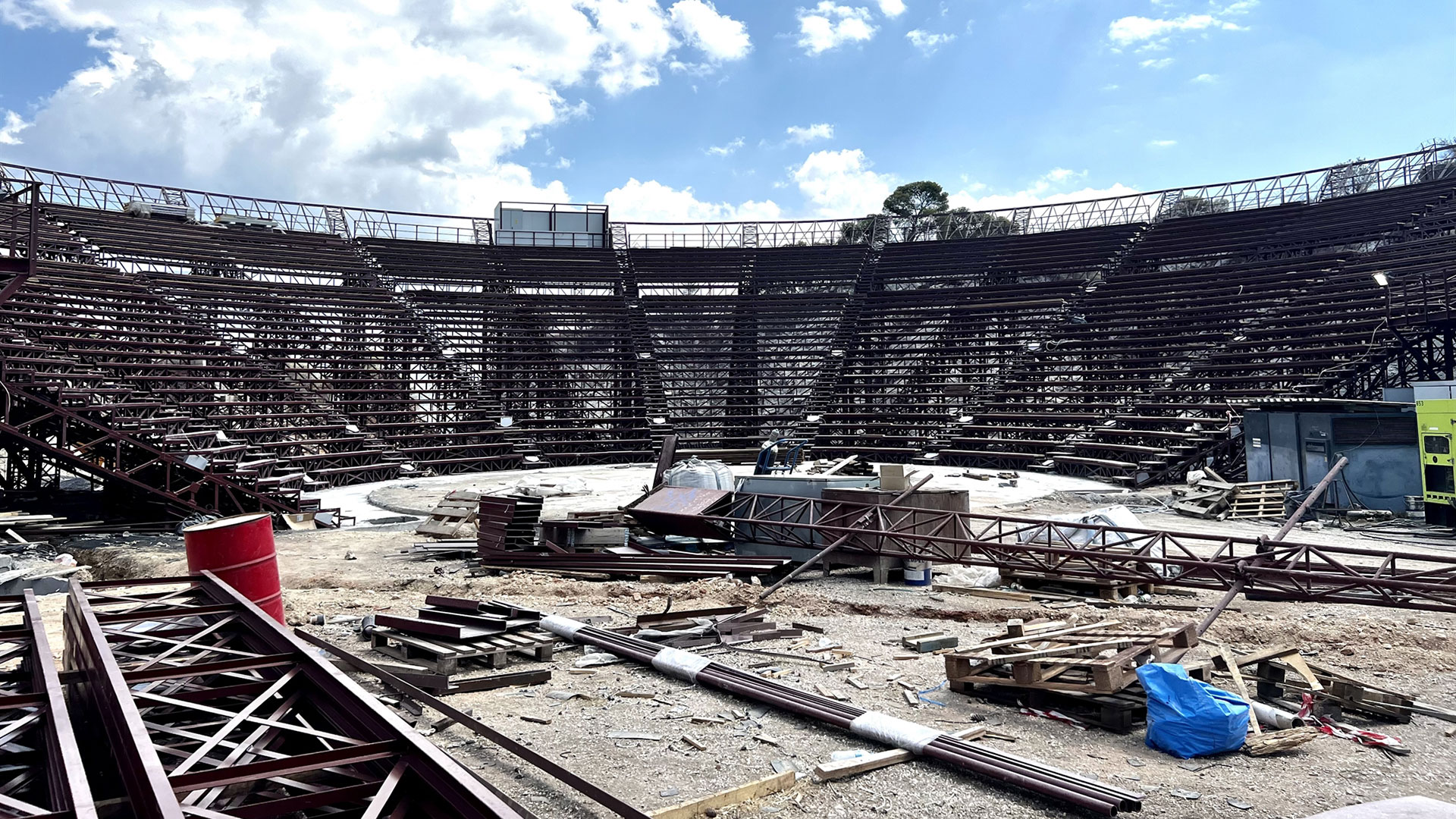 Είναι δύο το μεσημέρι και η ζέστη που έχει επιστρέψει για τα καλά στην Αθήνα κάνει τη ζωή δύσκολη στους εργάτες που είναι ακροβολισμένοι σε κάθε πιθανή και απίθανη γωνία του μεταλλικού σκελετού που κάποτε ήταν αιθέριες μολυβιές σε ένα κομμάτι χαρτί του αρχιτέκτονα Τάκη Ζενέτου. Ξέρουν ότι δεν έχουν κανένα περιθώριο για καθυστέρηση, καθώς ο χρόνος μετράει αντίστροφα για τις 15 Σεπτεμβρίου, όταν το Θέατρο του Λυκαβηττού θα επιστρέψει ξανά στη ζωή της Αθήνας με τη μεγάλη συναυλία του Σταύρου Ξαρχάκου, που ανακοινώθηκε την Τετάρτη.