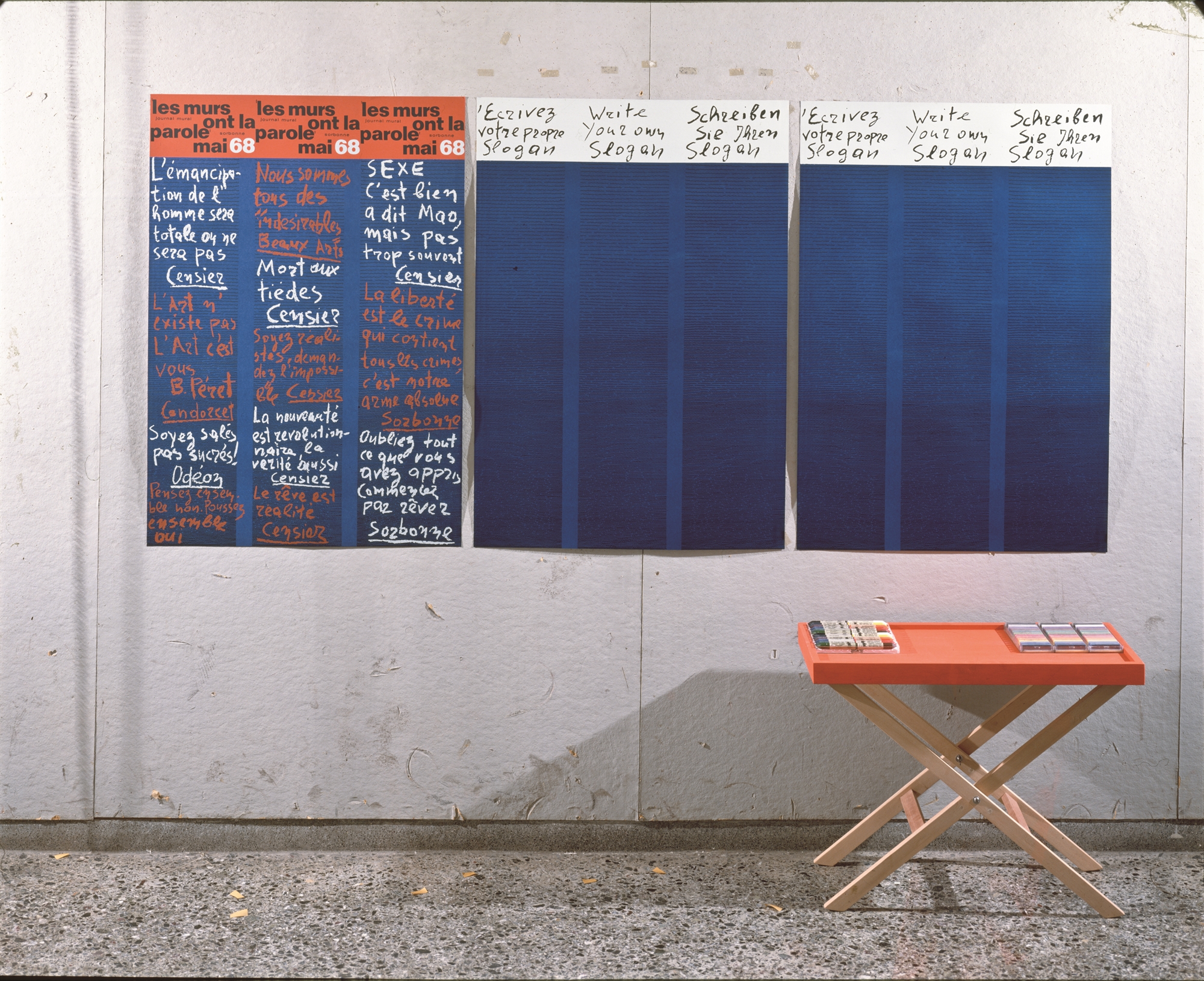 Σύμφωνα με την ίδια την καλλιτέχνιδα το έργο, ένα τρίπτυχο χειρόγραφο, εμπεριέχει την ιδέα της επετείου της εξέγερσης των φοιτητών στο Παρίσι το 1968, και πρωτοπαρουσιάστηκε στη Στουτγάρδη το 1979. Οπως συνέβη και τότε, έτσι και στην Αθήνα, μπροστά στο τρίπτυχο υπάρχει ένα μικρό τραπέζι με χρώματα παστέλ και κιμωλίες για να τα χρησιμοποιήσει το κοινό στο γράψιμό του.