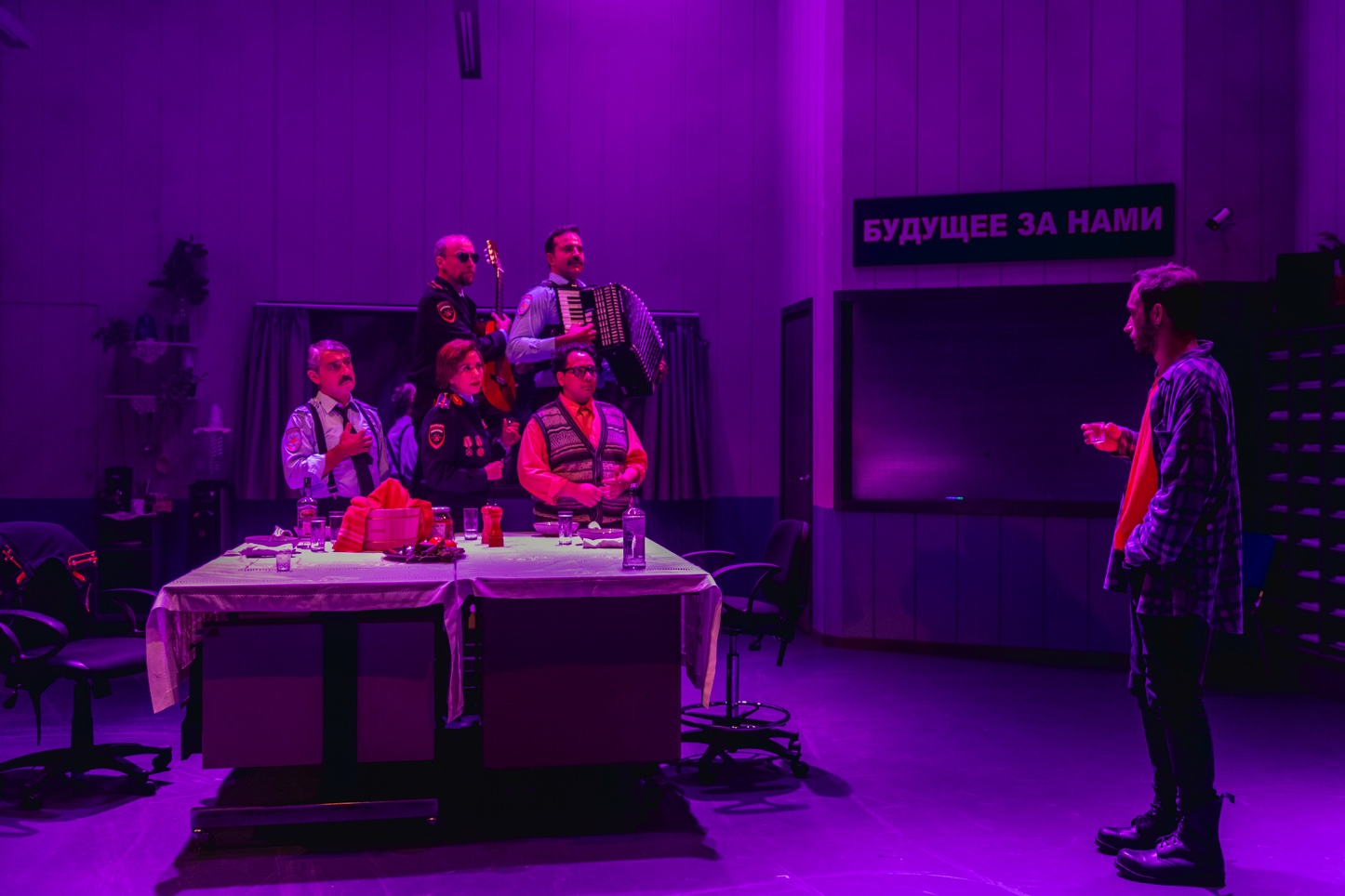 Το θέατρο του παραλόγου συμπίπτει αυτήν τη φορά με τον παραλογισμό του συστήματος, την επιθυμία του καθεστώτος να είναι όλοι πιόνια και υποχείριά του. Ο σκηνοθέτης ανέδειξε και τα τσεχοφικά στοιχεία του έργου, με το όνειρο απόδρασης στο Αμστερνταμ διαρκώς ζωντανό και τα μουσικά μοτίβα της κιθάρας, του ακορντεόν αλλά και των ήχων που συνέθεσε ο Παναγιώτης Μανουηλίδης, να πλαισιώνουν τη δράση. Δυναμική παράσταση, γεμάτη ρυθμό και ένταση, αναπτύσσεται μέσα σε ένα καλοσχεδιασμένο κάδρο του αστυνομικού τμήματος που σκηνογράφησε ο Πάρις Μέξης. Το θεατρικό βίωμα μετατράπηκε σταδιακά σε ένα οπτικοακουστικό πανδαιμόνιο, αρμονικά φωτισμένο από τον Αλέκο Αναστασίου. Ο Αρης Μπαλής στον πρωταγωνιστικό ρόλο παρακάμπτει με την ερμηνεία του τα κωμικά στερεότυπα και εναποθέτει στη σκηνή ένα πλέγμα αμηχανίας, απόγνωσης και άρρητου φόβου του Νικολάι. Δούλεψε άριστα ένα σωματικό και κινητικό κώδικα αποδίδοντας έναν ήρωα που ελέγχεται κυριολεκτικά και μεταφορικά από τον μηχανισμό του συστήματος και υποβάλλεται σε αυτήν την ιδιότυπη μορφή ανάκρισης. Ο στόχος του συστήματος είναι σαφής: θέλει να επιβάλει στον Νικολάι έναν τρόπο σκέψης, ώστε να μείνει προσηλωμένος στο όραμα της αναπτυσσόμενης Ρωσίας, να θαυμάζει τη χώρα του, να σκέφτεται και να δρα με βάση το συστημικό πρότυπο, να παραμένει ένα όργανο αυτού του καθεστώτος. Υποχρεώνεται στην εκμάθηση του «αστυνομικού χορού». Με την εκφορά δύσκολων συνδυασμών ήχων και χορευτικών κινήσεων, ο Νικολάι πρέπει να βελτιώσει τη λειτουργία του εγκεφάλου του. Με αυτές τις ιαχές, ο εγκέφαλος ξαναφτιάχνει νέες νευρωνικές συνάψεις, ανανεώνεται η ελαστικότητα του εγκεφάλου και βελτιώνεται η ικανότητα του ανθρώπου να σκέφτεται με βάση τα πρότυπα του εκάστοτε συστήματος. Αυτός ο παράδοξος τρόπος «νουθέτησης» μετατρέπει τον Νικολάι σε μαριονέτα. Είναι γνωστό άλλωστε ότι, στη Σοβιετική Ενωση, οι αντιφρονούντες θεωρούνταν ψυχικά ασθενείς και κλείνονταν σε ψυχιατρεία, γεγονός που οδήγησε στην εκδίωξη της σοβιετικής ψυχιατρικής από την Παγκόσμια Ψυχιατρική Εταιρεία.
