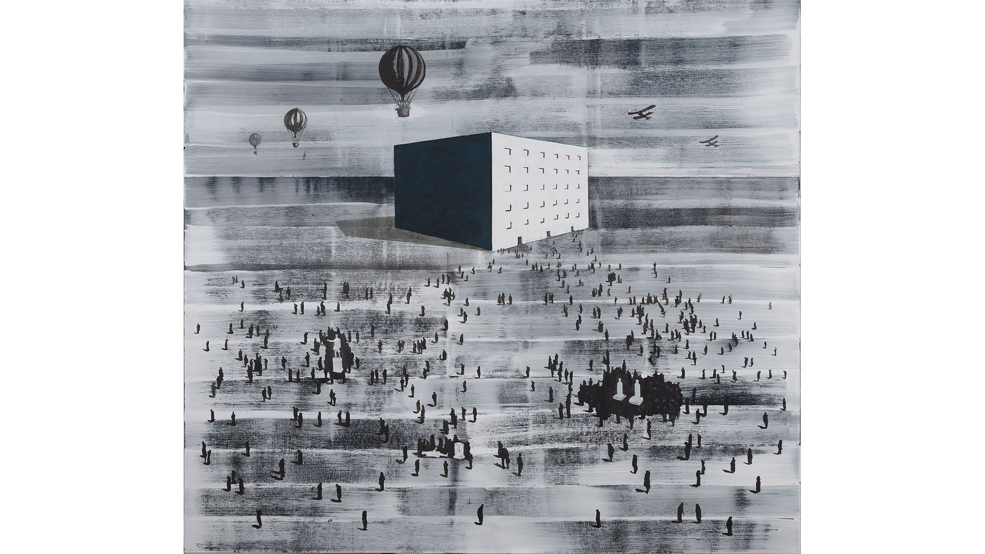 Η «εκκίνηση» της έκθεσης γίνεται από τον 4ο όροφο, με τους «Τόπους». Στο θέμα μάς εισάγουν οι αθηναϊκές τοπιογραφίες του Βικέντιου Λάντσα. Το κλασικό μοτίβο ερειπιογραφίας των τελών του 19ου αιώνα με τη ρομαντική ατμόσφαιρα και την αχλύ της εποχής της αρχαιότητας, η οποία ανακάμπτει μετά την ίδρυση του νέου ελληνικού κράτους, «συνδιαλέγεται» εδώ ακόμη και με πιο μινιμαλιστικά έργα όπως το «Αγάλματα και Πλήθος» του Ζάφου Ξαγοράρη. «Το ανώνυμο πλήθος ανάμεσα στα αγάλματα φέρνει αυτήν τη μνήμη της μνημειακής γλυπτικής, της αρχιτεκτονικής μέσα όμως από ένα πιο σύγχρονο βλέμμα. Μιλάει για μια πόλη που προσπερνά την ιστορία της, που μοιάζει να έχει ιστορική συνέχεια, αλλά τελικά αυτή ενεργεί ως παράταιρο στοιχείο στην καθημερινότητα των κατοίκων της. Προσπαθώ να πω πώς η συνάφεια ανάμεσα σε κάποια έργα μπορεί να προκύπτει μέσα από μια σκέψη, δεν σημαίνει ότι οι καλλιτέχνες “συναντιούνται” ή ότι ο Ξαγοράρης έχει αναφορά στον Λάντσα. Αντλώ από τα οπτικά ερεθίσματα που μου δίνουν οι πίνακες και προσπαθώ να δημιουργήσω ένα παιχνίδι», υπογραμμίζει η κυρία Κανελλοπούλου.Πολύ ενδιαφέρουσα θεωρεί και τη συνομιλία ανάμεσα στα τοπία των Ιωάννη Αλταμούρα, Κωνσταντίνου Μαλέα και Βαλερίου Καλούτση, εστιάζοντας ιδιαίτερα στις παραπλήσιες τονικότητες ανάμεσα σε αυτές τις τρεις εκδοχές τοπίων με την εντελώς διαφορετική διαχείριση στον τρόπο εικαστικής έκφρασης. Οι μετατοπίσεις από τη μια εποχή στην άλλη γίνονται πιο εμφανείς, όπως φυσικά και τα κίνητρα που πυροδότησαν την έμπνευση των τριών καλλιτεχνών. Και έτσι παρατηρούμε ότι περνάμε από τη σχεδόν ιμπρεσιονιστική αποτύπωση της φύσης των τελών του 19ου αιώνα στο σχόλιο για την ερημοποίησή της στα τέλη του 20ού, χωρίς η αφήγηση να κομπιάζει…
