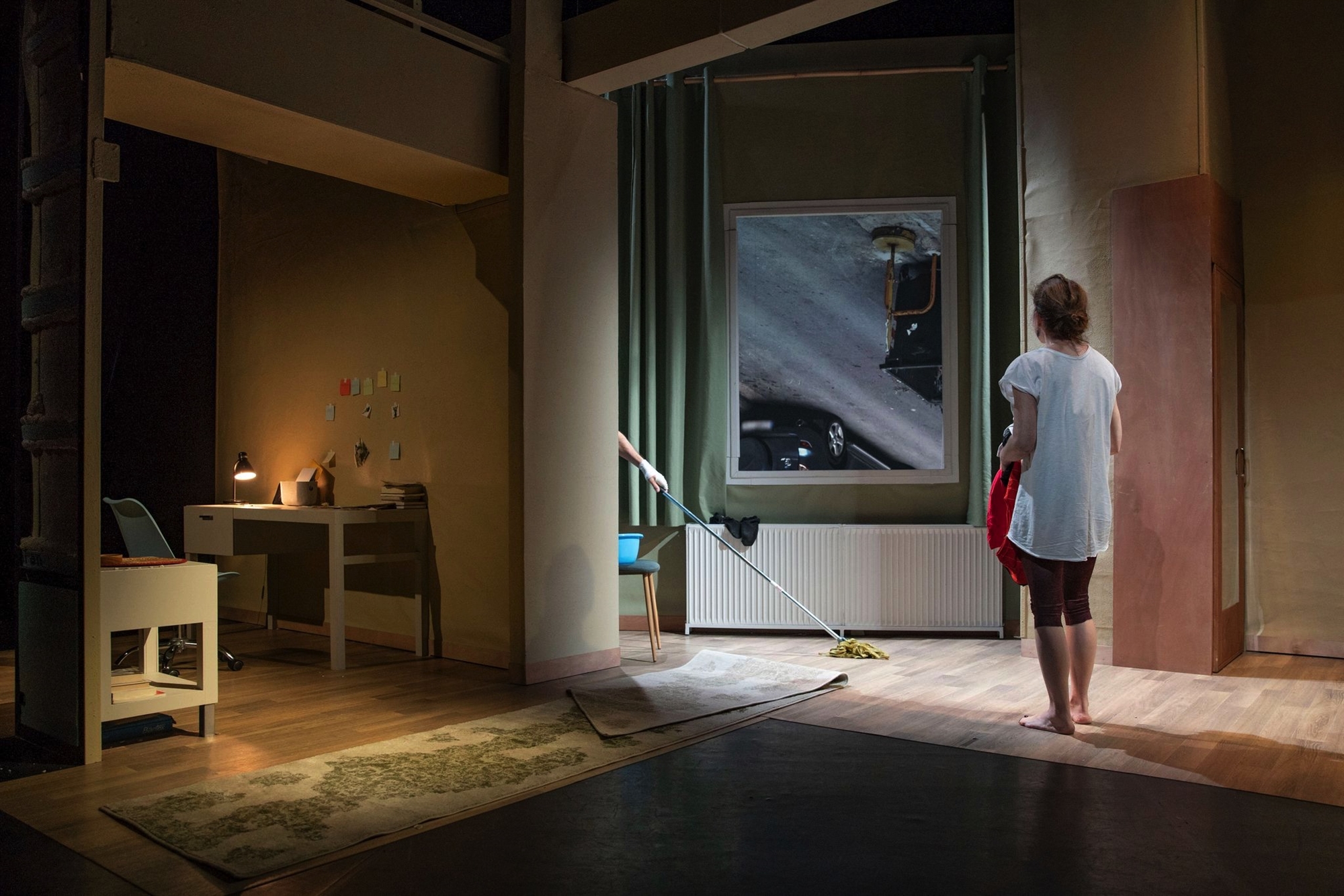 Δύο συγκάτοικοι, ένα ζευγάρι συζύγων, φίλων, συγγενών, ανώνυμες οντότητες απροσδιόριστης ταυτότητας, συνομιλούν χαμηλόφωνα, κινούνται μηχανικά, παρατηρούν αδρανείς τη ζωή τους να περνάει και να ξεδιπλώνεται παράλληλα με ένα σύνολο εικόνων που προβάλλονται στο μοναδικό παράθυρο του λειτουργικού σπιτιού τους: εικόνες του δρόμου, των εξωτερικών χώρων και των γειτονικών πολυκατοικιών. Οι κουβέντες τους καθημερινές, τετριμμένες, καλύπτονται τις περισσότερες φορές από τον ήχο του πλυντηρίου, τη μόνιμη επωδό της άχαρης ζωής τους. Τακτοποιούν τα ρούχα, τα παπούτσια, σφουγγαρίζουν, ξεσκονίζουν, σκοτώνουν κουνούπια, αποκαλύπτονται ως πρόσωπα μετέωρα σε ένα εικαστικό τοπίο, φοβογόνο και παραισθητικό, χωρίς ωστόσο κάτι να προοικονομεί ότι η διαμονή τους στο σπίτι είναι προσωρινή. Η τακτοποιημένη και πληκτικά αφόρητη καθημερινότητά τους καταλήγει σε ένα δραματικό παιχνίδι αποδόμησής της με φόντο τη σύγχρονη πόλη. Η πόλη της ρύπανσης, των πολεμικών συρράξεων, των βομβαρδισμών, των προσφυγικών καταυλισμών, των απωλειών και της απουσίας. Η στοιχειωμένη πόλη της μοναξιάς και της ματαίωσης, η αδιέξοδη πόλη της αποκοπής των νημάτων που μας συνδέουν με τους άλλους. Η χαμένη πόλη των παραδοσιακών αυλών και των χαμηλών σπιτιών, η γιγάντια πόλη των «νεκρών» προσώπων που εκπνέουν αέρα, που μιλούν για να μην πουν τίποτε… Πόσο μας αφορά αυτή η πόλη με τους αδρανείς κατοίκους της και τα φαντάσματα που τους κυνηγούν;