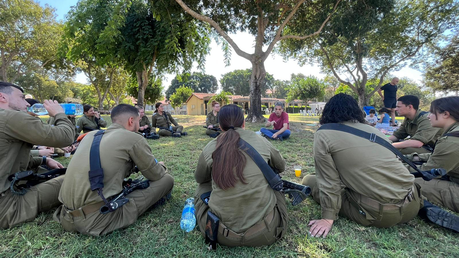 «Τις τελευταίες δέκα ημέρες πηγαίνω όπου θέλουν να με δουν. Οι επιζώντες από τα κιμπούτς που δέχθηκαν επίθεση έχουν σκορπιστεί σε ξενώνες και ξενοδοχεία και πηγαίνω να τους δω, να τους μιλήσω, να διαβάσω σε ενήλικες και παιδιά». Οι ιστορίες των ανθρώπων τον συγκλονίζουν, λέει. «Θα σου αφηγηθώ μία που θα σου φανεί εντελώς τρελή. Μια μέρα λαμβάνω ένα σημείωμα από τον επικεφαλής μιας μονάδας πεζικού που μου γράφει ότι πηγαίνει στη μάχη, μου δίνει τα στοιχεία της πρώην κοπέλας του που δεν του μιλάει πια και μου ζητάει, αν πεθάνει, να πάω σε αυτήν και να της πω ότι λυπάται πολύ για ό,τι έγινε. Τον ρωτάω “γιατί εγώ” και μου εξηγεί ότι είναι τόσο θυμωμένη μαζί του, ενώ εγώ είμαι ο αγαπημένος της συγγραφέας, οπότε θα μου μιλήσει. Της τηλεφωνώ, της λέω τι συμβαίνει και αυτή αρχίζει να μου εξηγεί τι της έκανε ο πρώην σύντροφός της! Στο τέλος της υποσχέθηκα ότι κάθε δύο μέρες θα της στέλνω μια μικρή ιστορία, κάτι που κάνω και με τους επιζώντες που συναντώ. Σημειώνω το όνομά τους και υπόσχομαι ότι θα γράφω και θα τους στέλνω ιστορίες, για να μησκέφτονται τον πόλεμο».
