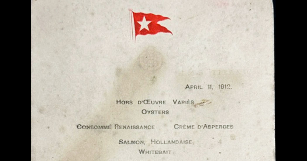 Στρείδια, σολομός με σάλτσα Ολαντέζ ή μοσχάρι. Πουλερικά επίσης, όπως πάπια, πιτσούνια και ψητό κοτόπουλο, καθώς και πράσινα μπιζέλια, πουρές από παστινάκι και πουτίγκα. Αυτές ήταν μερικές από τις επιλογές των επιβατών της πρώτης θέσης του «Τιτανικού», το βράδυ της 11ης Απριλίου 1912, τρεις ημέρες πριν από τη μοιραία πρόσκρουση του υπερωκεάνιου σε ένα παγόβουνο. Το μενού εκείνης της βραδιάς (με εμφανή τα σημάδια της φθοράς που υπέστη από το νερό) έφτασε στα χέρια του Αντριου Αλντριτζ, διευθυντή του βρετανικού οίκου δημοπρασιών Henry Aldridge & Son Ltd. Για την ακρίβεια, το μενού στάλθηκε το περασμένο καλοκαίρι στον Αλντριτζ από ένα συγγενή του ιστορικού Λεν Στίφενσον (1921-2017), ο οποίος είχε ασχοληθεί με την ιστορία και τα ευρήματα του «Τιτανικού». Θα βγει σε πλειστηριασμό το Σαββατοκύριακο και εκτιμάται ότι θα δημοπρατηθεί έναντι 70.000 λιρών. Το 2012, ένα μενού από το τελευταίο μεσημεριανό γεύμα των επιβατών της πρώτης θέσης είχε δημοπρατηθεί έναντι 120.000 δολαρίων. Τρία χρόνια αργότερα, το μενού του τελευταίου δείπνου (πάντα της πρώτης θέσης) είχε βγει στο σφυρί για 118.000 δολάρια. Οι γνώστες της ιστορίας του «Τιτανικού», έλεγε στους New York Times ο Αντριου Αλντριτζ, ξέρουν αν υπάρχουν άλλα αυθεντικά μενού και πού βρίσκονται. Η ανακάλυψη όμως του συγκεκριμένου –του μοναδικού με ημερομηνία 11 Απριλίου 1912– ήταν αναπάντεχη.
