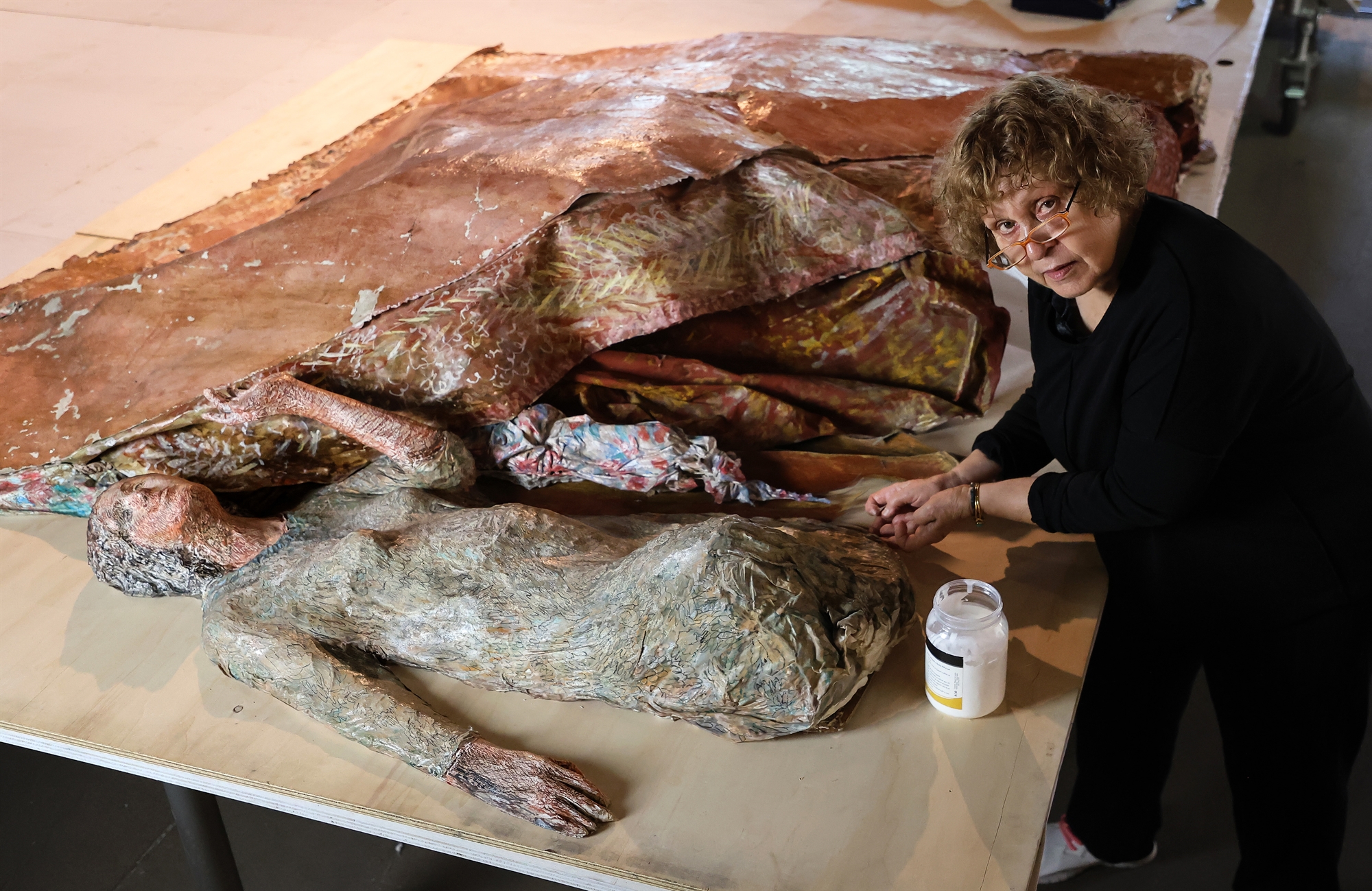 Παρατηρώ την καλλιτέχνιδα σκυμμένη πάνω στο Baalbeks να αγγίζει το έργο αναζητώντας τα σημεία που χρειάζονται στερέωση, σαν να ψηλαφίζει τα σπλάχνα ενός ζωντανού οργανισμού. Οπως κάνει πάντα –το ξέρουμε όσοι τη γνωρίζουμε– προτιμά να εργάζεται παρά να μιλάει, μια απολύτως βιωματική δημιουργός, που επί σχεδόν έξι δεκαετίες «συνομιλεί» με τα φαινομενικά ασήμαντα και αόρατα πράγματα που μας περιτριγυρίζουν. Παρά τα 85 της χρόνια διατηρεί το βλέμμα του παιδιού που όλοι ήμασταν κάποτε, εκείνου που με τη φαντασία του αναπλάθει μαγικές εικόνες από τα ίχνη του χρόνου που έχουν αποτυπωθεί στους σοβάδες – τις χαρακιές, τις ρωγμές, τα σκασίματα, τα σκισίματα, τα ξεθωριασμένα χρώματα, τα σκεβρωμένα σχήματα. «Το πέρασμα του χρόνου και η αλχημεία των αισθήσεων», θα μπορούσε να επιγράφεται το εικαστικό γλωσσάρι της δουλειάς της.