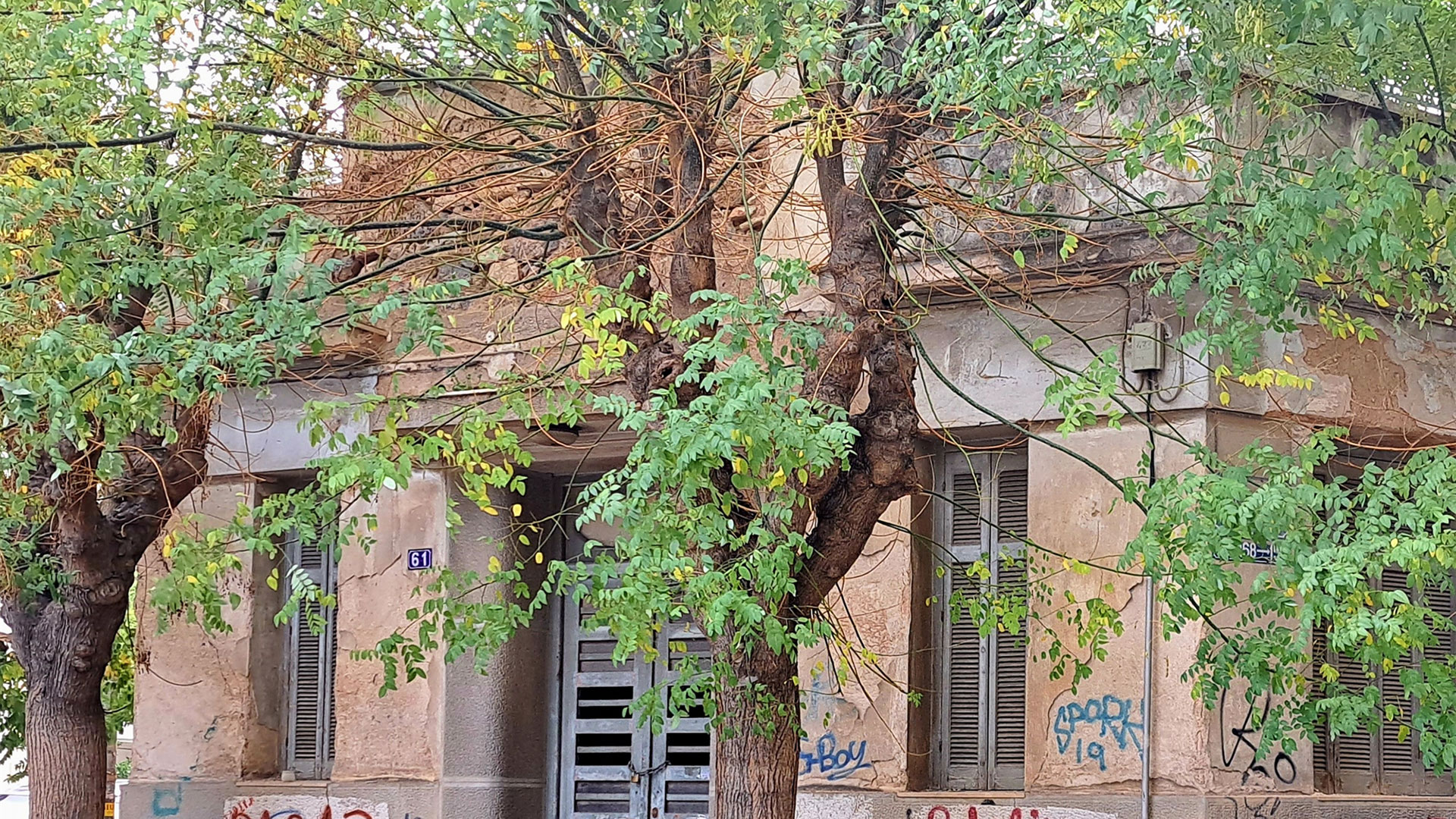 Ακόμη πιο πολύ μου τράβηξε την προσοχή η αυλή, την οποία προσεγγίζει κανείς από την οδό Ιωαννίνων. Εχει χώμα και πεζούλες. Σκιάζεται από ψηλή μεσοτοιχία και δύο λεμονιές. Λεμονιές έχει και η διπλανή στο βάθος αυλή, που μόλις διακρινόταν, του αριθμού 59. Μπορούσε εύκολα κανείς να φανταστεί την καθημερινότητα. Ενας βίος ημιυπαίθριος, μια αυλή για μια οικογένεια. Μια μεταλλική σκάλα ανεβάζει στο ταρατσάκι. Βαθμίδες και πεζούλες δίνουν προοπτική στην αυλή. Πόσο θα ζήσει ακόμη;