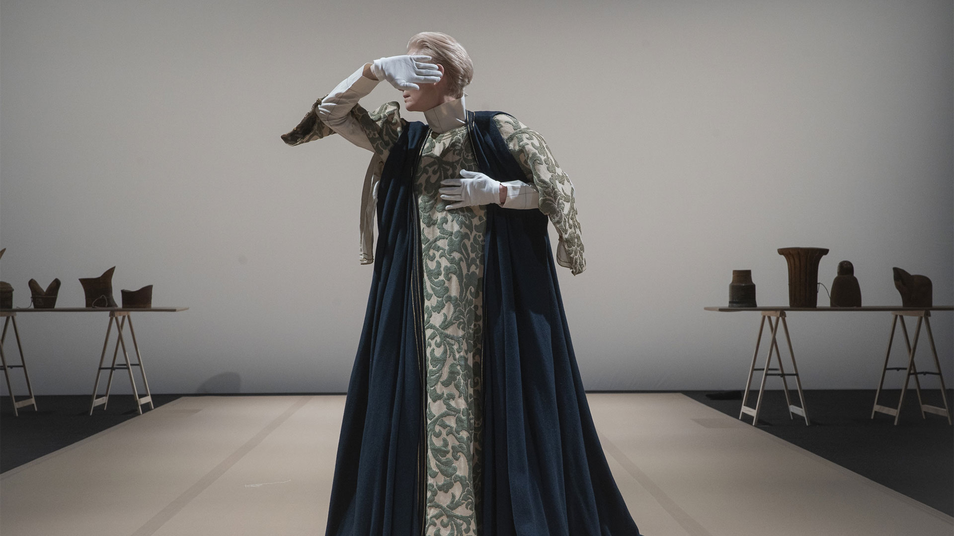 «Ακόμη κοιτάζουμε το υλικό μας, ακόμη ψάχνουμε για χρυσό», λέει η Σουίντον περιγράφοντας τον δυναμικό τρόπο με τον οποίο δουλεύεται η υβριδική παράσταση. Αναφερόμενη στα κοστούμια που φοράει σε αυτή την αυτοσχέδια πασαρέλα, η βραβευμένη με Οσκαρ ηθοποιός μιλάει για «κοσμήματα», «μνημεία», «γλυπτά έργα τέχνης», «παγκόσμια σήματα». Τα φοράει ή τα ακουμπά επάνω της, περπατάει στηρίζοντας στο κεφάλι της τεράστια καπέλα και το βάδισμά της ρέει σαν την κινηματογραφική εικόνα.