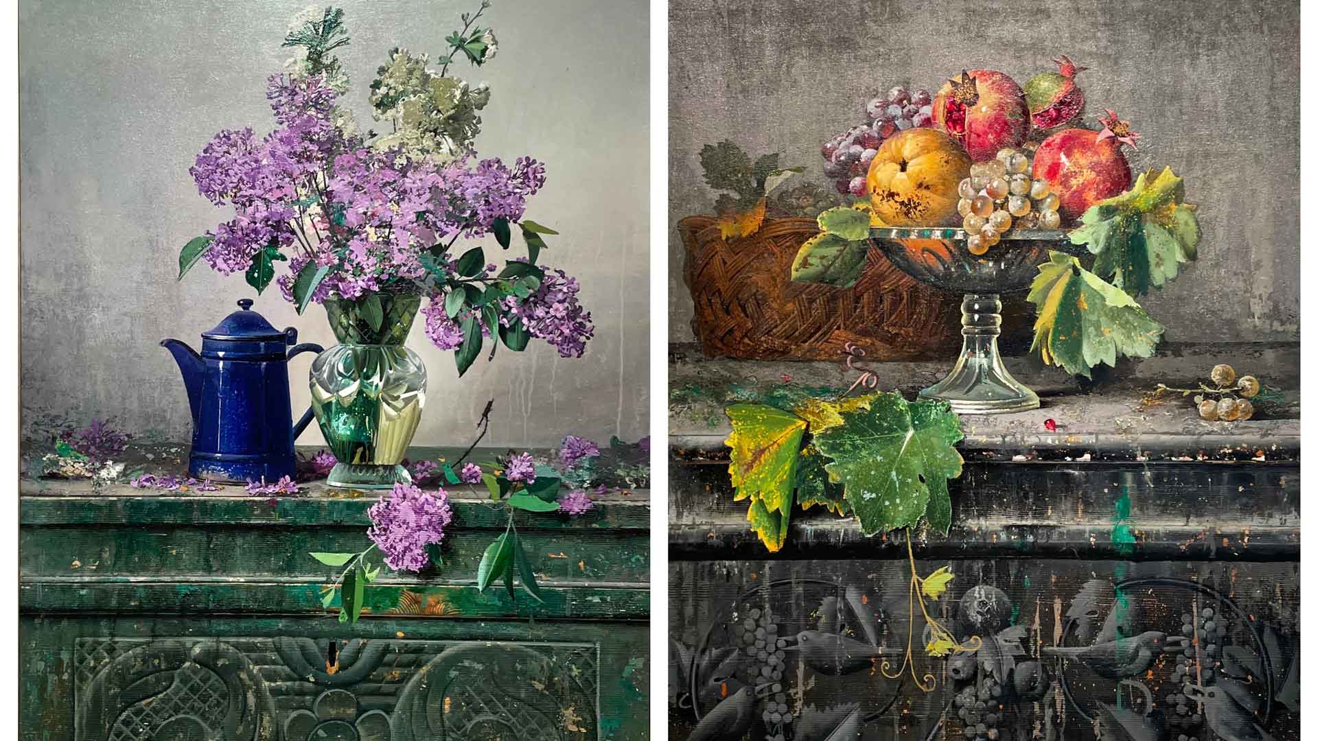 Τα χρώματα· τα κόκκινα, τα μπλε, τα μαβιά, τα χρυσά, η σάρκα των καρπών και το βαρύ άρωμα των ανθέων, μπλέκουν αντηχήσεις από φλαμανδικά εσωτερικά, πένθιμες λάμψεις από ελληνικό Πάσχα και οινοποσίες σε οικογενειακά τραπέζια. Μια έκθεση δεξιοτεχνίας αλλά και ακριβής ευαισθησίας.