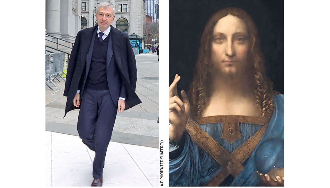 Οπως είπαμε πρόκειται για έργα και αγορές επιπέδου… μπλοκμπάστερ. Ενα από τα τέσσερα αντικείμενα για τα οποία το δικαστήριο θα εξετάσει τους όρους αγοράς τους –για όλα τα υπόλοιπα κρίθηκε ότι δεν υπάρχουν επαρκή στοιχεία– είναι ο περίφημος «Salvator Mundi», ο «Ιησούς Σωτήρας του Κόσμου» δηλαδή, του Λεονάρντο ντα Βίντσι, τον οποίο ο Ριμπολόβλεφ απέκτησε έναντι 127,5 εκατ. δολαρίων στις 3 Μαΐου 2013 μέσω του Μπουβιέ. Μία ημέρα νωρίτερα, ωστόσο, εκείνος είχε προλάβει να αγοράσει μυστικά (από τον Sotheby’s) τον πίνακα για αρκετά μικρότερο ποσό – η διαφορά κατέληξε προφανώς στην τσέπη του Ελβετού. Εντέλει, βέβαια, και ο Ρώσος δεν βγήκε φοβερά ζημιωμένος. Τέσσερα χρόνια αργότερα, πούλησε, μέσω του οίκου Christie’s αυτή τη φορά, τον «Salvator Mundi» προς 450 εκατ. δολάρια, ποσό ρεκόρ στην ιστορία της αγοράς της τέχνης. Αγοραστής ήταν ο διάδοχος του θρόνου της Σαουδικής Αραβίας, Μοχάμεντ μπιν Σαλμάν.