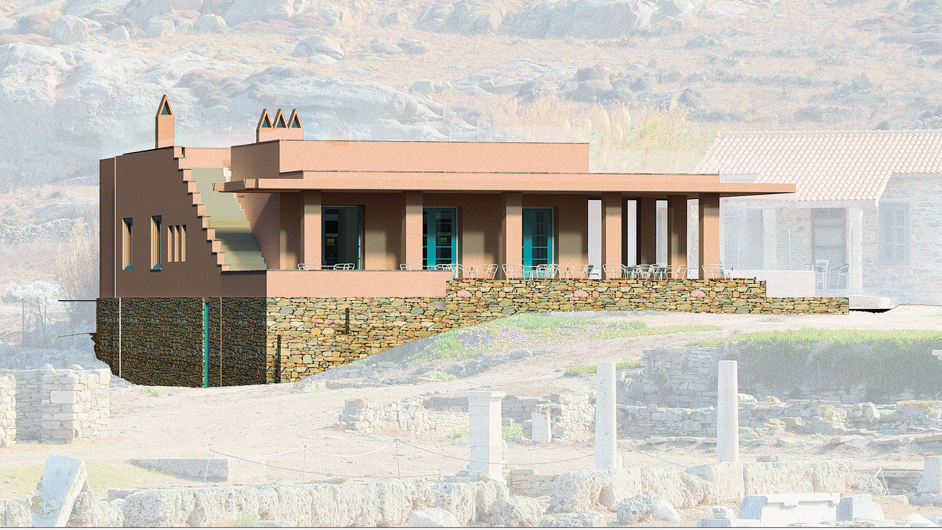 Εκείνος σχεδίασε τον «ξενώνα» με χώρο εστίασης, συνδυάζοντας το πνεύμα του μεταβατικού μοντερνισμού του Μεσοπολέμου και επιμέρους στοιχεία που παραπέμπουν στη λαϊκή κυκλαδίτικη αρχιτεκτονική: τα μοντερνιστικά χαρακτηριστικά του κτιρίου εντοπίζονται μεταξύ άλλων στο στέγαστρο από οπλισμένο σκυρόδεμα που καλύπτει τον ημιυπαίθριο χώρο και προεκτείνεται δημιουργώντας μια ανοιχτή στοά προς τον αρχαιολογικό χώρο, ενώ στοιχεία ανώνυμης αρχιτεκτονικής αποτελούν το επίπεδο δώμα αντί στέγης, το μέγεθος των ανοιγμάτων και η εξωτερική κτιστή σκάλα που μειώνει τον όγκο του κτιρίου.
