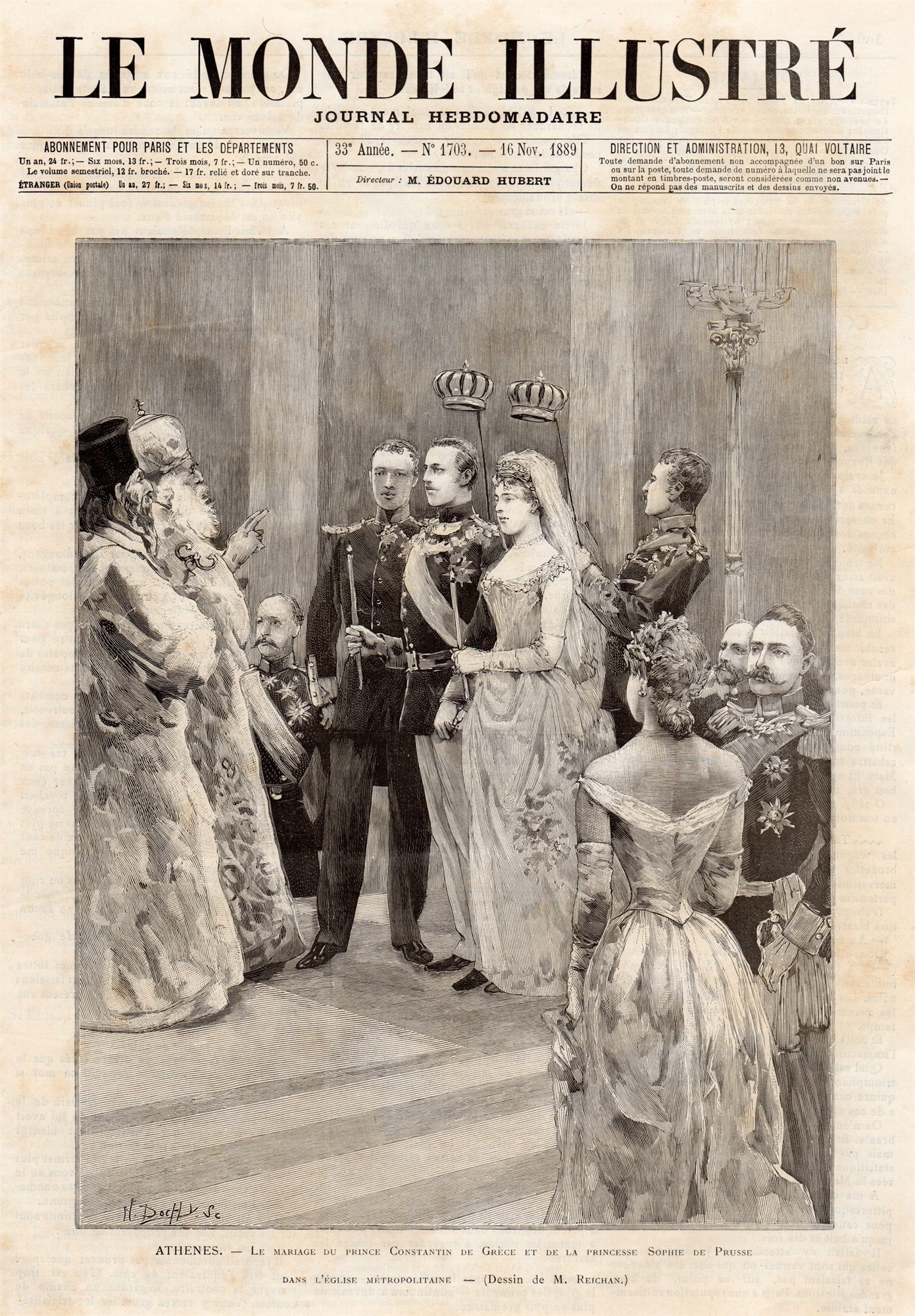 Ο γάμος της Σοφίας με τον διάδοχο του ελληνικού θρόνου Κωνσταντίνο προήλθε από έρωτα. Γνωρίστηκαν στο Λονδίνο το 1887. Εκείνος ήταν 19 ετών, εκείνη 17. Ο διεθνής περίγυρος ήταν ευνοϊκός για τον γάμο, και στην Αθήνα ο πρωθυπουργός Χαρίλαος Τρικούπης ήθελε τη μεγαλύτερη δυνατή μεγαλοπρέπεια. Ηταν ένα σημαντικό «τεστ» για την Αθήνα στη διεθνή σκηνή. Η Σοφία, μεγαλωμένη σε πρωσικό περιβάλλον, σε διαφορετικό κλίμα και ανάμεσα σε δάση και πλούσια χλωρίδα, ήταν υποχρεωμένη να εγκλιματιστεί σταδιακά σε μια κοινωνία που της ήταν ξένη. Υπέφερε από τη ζέστη της Αθήνας. Ο χαρακτήρας της, αδαμάντινος και με μεγάλη αυτοκυριαρχία, ιδιότητες που συχνά ήταν αιτίες παρεξηγήσεων, τη δέσμευε και την προστάτευε ταυτόχρονα.