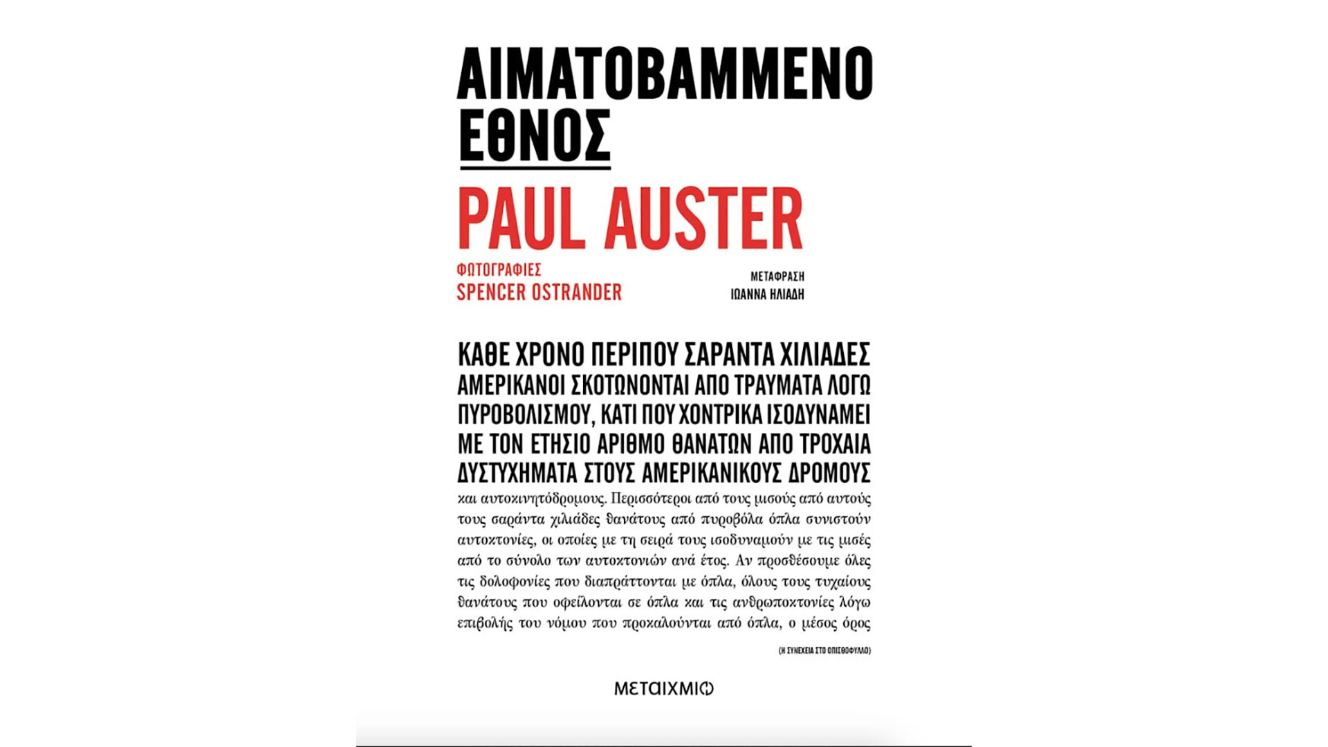 Ενα όπλο σκότωσε τον παππού του Πολ Οστερ και κατέστρεψε την οικογένεια του πατέρα του. Ο φημισμένος συγγραφέας έμαθε για την τραγική ιστορία της οικογένειάς του πολύ αργότερα στη ζωή του, όταν –ευτυχώς– η σχέση του με τα όπλα περιοριζόταν στις ταινίες γουέστερν του σινεμά. Δεν συμβαίνει όμως σε όλους το ίδιο. Περίπου 40.000 Αμερικανοί σκοτώνονται κάθε χρόνο από πυροβόλα, όπως γράφει στο δοκίμιο «Αιματοβαμμένο έθνος» που κυκλοφορεί από τις εκδόσεις Μεταίχμιο. Η έρευνά του για τη βία των όπλων συνοδεύεται από τις φωτογραφίες του Σπένσερ Οστράντερ, ο οποίος αποτύπωσε στον φακό τους τόπους στους οποίους είχαν σημειωθεί μαζικά περιστατικά πυροβολισμών.