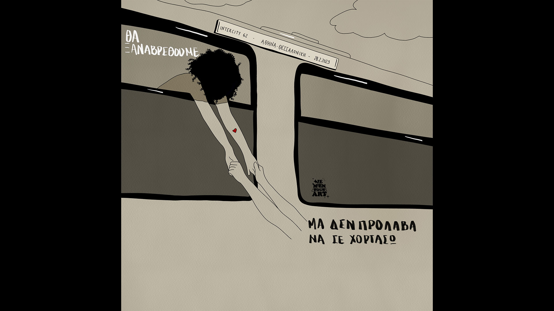 Το δρομολόγιο που θα τους χωρίσει βέβαια είναι το μοιραίο IC62, που στις 28 Φεβρουαρίου 2023 ξεκίνησε από την Αθήνα και τερματίστηκε στα Τέμπη, στο σιδηροδρομικό δυστύχημα που στοίχισε τη ζωή 57 επιβατών. Γι’ αυτό και το σκίτσο που δημιούργησε ένα χρόνο μετά εκείνη τη νύχτα, αν και «επιτυχημένο», δεν προκαλεί ακριβώς ικανοποίηση στη δημιουργό του. «Είναι ανάμεικτα τα συναισθήματα», λέει στην «Κ» η εικονογράφος με το ψευδώνυμο Je m’en fous και συνεχίζει: «Παίρνει hype κάτι τόσο θλιβερό, και από τη μία με χαροποιεί, από την άλλη με στενοχωρεί. Δεν ξέρω πώς να το διαχειριστώ».