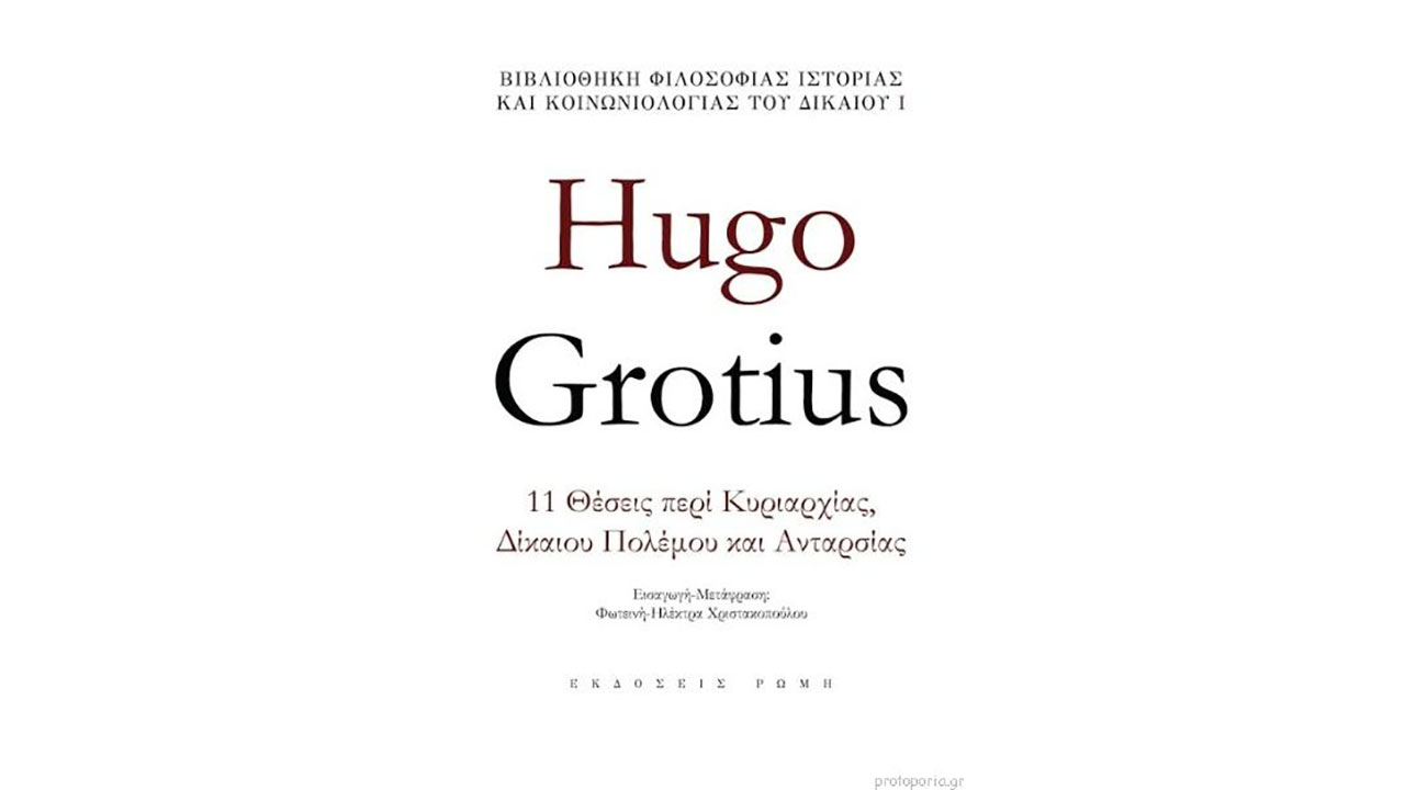 Πρόσφατα μεταφράστηκαν στα ελληνικά ως μέρος μιας εξαιρετικά επιμελημένης έκδοσης των εκδόσεων Ρώμη οι «11 θέσεις περί Κυριαρχίας, Δίκαιου Πολέμου και Ανταρσίας». Το έργο αυτό γράφτηκε σε καιρούς δύσκολους. Ο ογδοηκονταετής πόλεμος (1568-1648) μεταξύ των ολλανδικών επαρχιών και των Αψβούργων μαίνεται, ενώ στο εσωτερικό δεν λένε να κοπάσουν οι θρησκευτικές διαμάχες μεταξύ Καλβινισμού και Αρμινιανισμού (περίπου 1602-08). Οι έντεκα θέσεις αν και παρέμεναν για πολλά χρόνια ένα αδημοσίευτο χειρόγραφο είναι εξαιρετικά σημαντικές καθώς συμπεριλαμβάνουν και αποτυπώνουν σε πρώιμη μορφή μία σειρά από ιδέες τις οποίες ο Γκρότιους θα αναπτύξει και θα καταστήσει κεντρικές στο μετέπειτα έργο του.