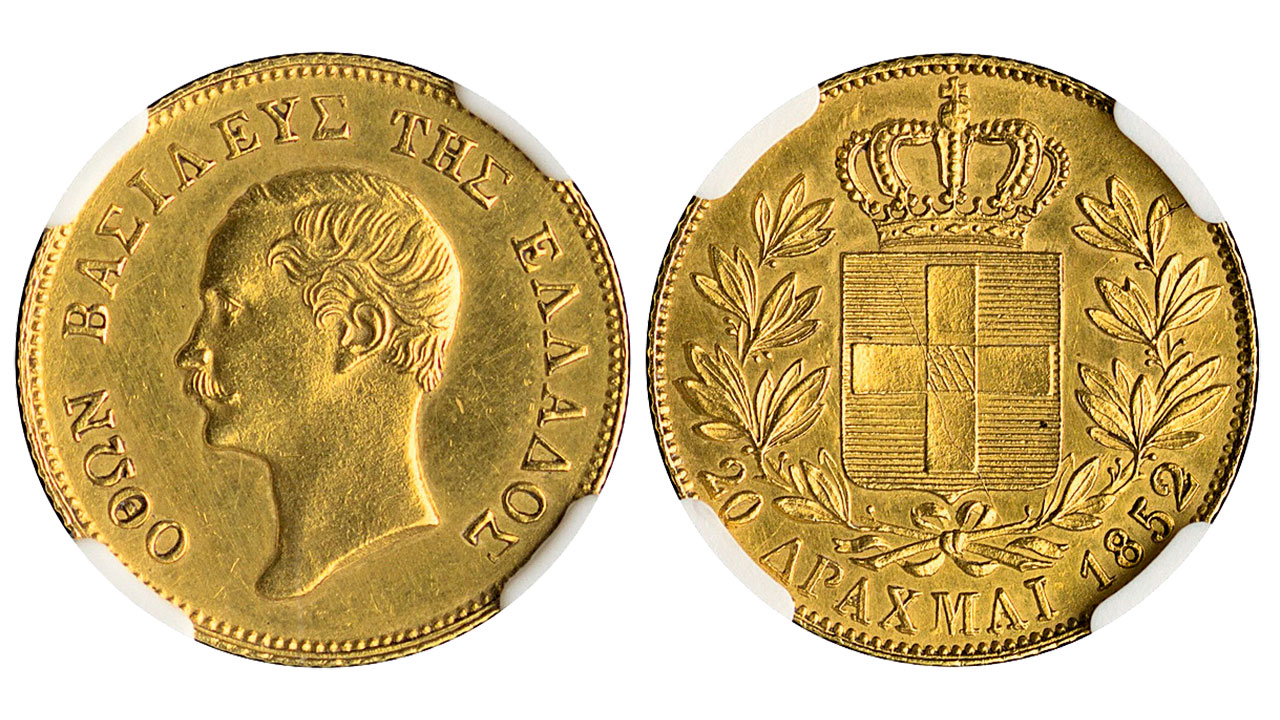 Πολλά από τα νομίσματα που εμφανίζονται στη δημοπρασία της 23ης Μαρτίου είναι σπάνια, γνωστά στους μελετητές και συλλέκτες αλλά δυσεύρετα και ακριβοθώρητα. «Ως ναυαρχίδα της συλλογής σίγουρα θα επιλέγαμε το χρυσό νόμισμα των 20 δραχμών του 1852 (λαχνός 126)», λέει ο κ. Πολυδεύκης Καραμήτσος. «Τελευταία φορά δημοπρατήθηκε στη δημοπρασία του οίκου Spink το 1979. Είναι συνολικής κοπής 16 τεμαχίων και το συγκεκριμένο είναι το τρίτο γνωστό εκτός μουσείων. Δεν είναι μοναδικό, όπως άλλα, σίγουρα όμως είναι ένα από τα δύο πιο γνωστά ελληνικά σύγχρονα νομίσματα παγκοσμίως και το ενδιαφέρον για την απόκτησή του έχει εκδηλωθεί από συλλέκτες παγκοσμίως». Το νόμισμα αυτό έχει τιμή εκτίμησης 625.000 ελβετικά φράγκα (652.000 ευρώ).