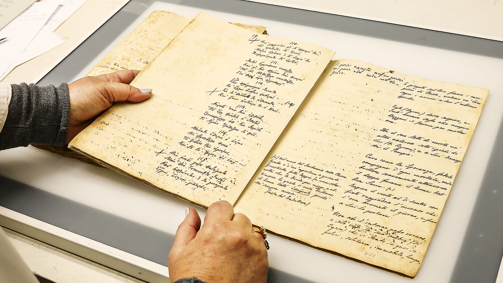 Κουβεντιάζοντας έχουν σχεδόν ξεχάσει την παρουσία μας στον χώρο, καθώς η ερώτηση για την ηλικία του χαρτιού στα χειρόγραφα που απλώνονται στο τραπέζι έχει πυροδοτήσει επιστημονικούς προβληματισμούς. Είναι το χαρτί των εύθρυπτων φύλλων, προγενέστερο της εποχής που ο Διονύσιος Σολωμός έγραψε σε αυτά την «Ωδή εις τον Θάνατον του Λορδ Μπάυρον»; ΄Η τη «Γυναίκα της Ζάκυθος»; Ή δοκιμές και στίχους για τους «Ελεύθερους Πολιορκημένους»;