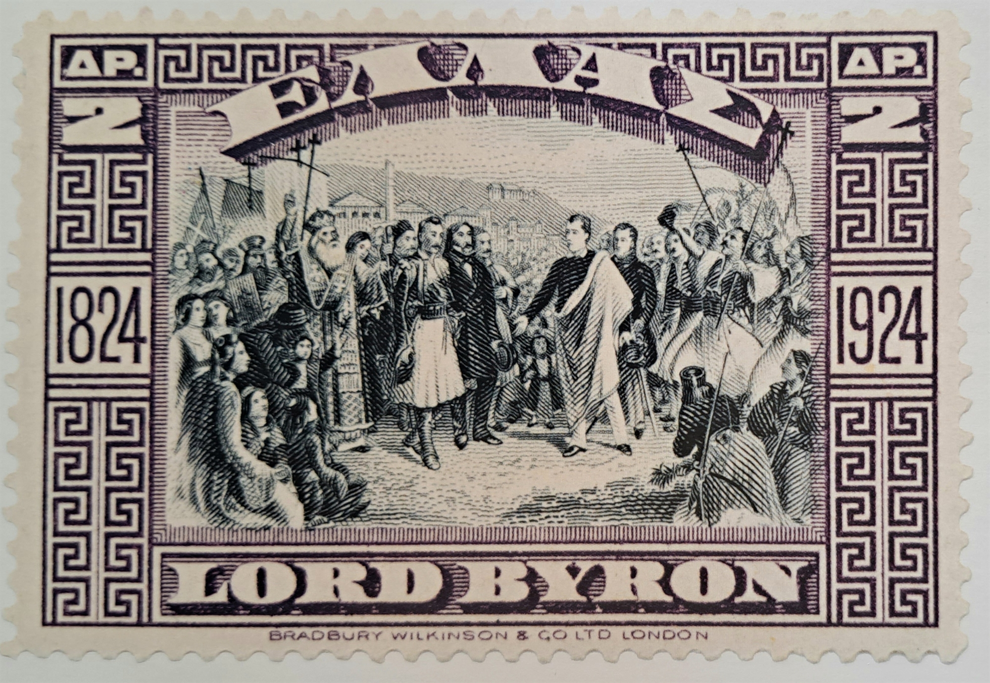 Εκείνη τη χρονιά, το 1924, είχαν κυκλοφορήσει στην Ελλάδα και δύο από τα ωραιότερα γραμματόσημα. Ηταν τα πρώτα που είχαν αφιερωθεί στον Λόρδο Βύρωνα και έκτοτε εκτιμώνται ιδιαίτερα από τους φιλοτελιστές αλλά και τους βυρωνιστές παγκοσμίως. Είναι πράγματι θαυμάσια εκτελεσμένα, σε χρώματα γαλάζιο, βιολέ και μαύρο, το ένα απεικονίζει τη μορφή του Βύρωνα με απόδοση του γνωστού έργου του Τόμας Φίλιπς από τον Νικόλαο Λύτρα. Και το άλλο, είναι μια ελεύθερη σύνθεση από την υποδοχή του Βύρωνα στο Μεσολόγγι κατά Θ. Π. Βρυζάκη. Το ιδιαίτερο στοιχείο είναι ότι τα γραμματόσημα αυτά, τα πρώτα με τα οποία η Ελλάδα τιμούσε τον Βύρωνα, τυπώθηκαν στην Αγγλία, στο αρτιότερο τυπογραφείο γραμματοσήμων και χαρτονομισμάτων με τη μέθοδο της χαλκογραφίας (Bradbury Wilkinson & Co). Οπως αναφέρει ο Θανάσης Παπαϊωάννου στο βιβλίο του «Γραμματόσημο και Ιστορία», «πουλήθηκαν 4.150.000 πλήρεις σειρές».