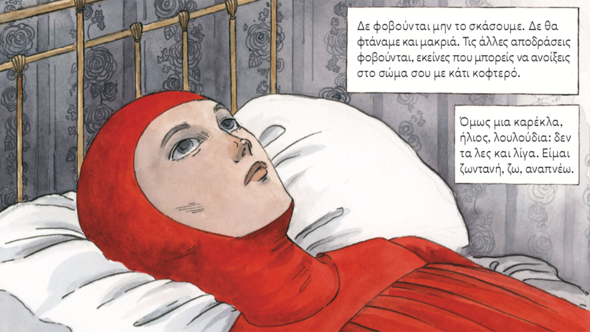 Για καλή του τύχη, το μυθιστόρημα έπεσε σε καλά κι επιδέξια χέρια, γεγονός που επιβεβαιώθηκε απ’ την ίδια την Ατγουντ. Στο εικονογραφημένο βιβλίο παρακολουθούμε την πρωτοπρόσωπη αφήγηση της θεραπαινίδας Τουφρέντ (αυτή που ανήκει στον Φρεντ), στην οποία η Δημοκρατία της Γαλαάδ έχει προσφέρει μόνο μία επιλογή: την αναπαραγωγή. Οπως αναφέρει ο εκδότης, «αν παρεκκλίνει απ’ τον σκοπό της, θα καταλήξει, όπως όλοι οι αντιφρονούντες, κρεμασμένη στο Τείχος, ή θα σταλεί στις Αποικίες, όπου θα βρει αργό και μαρτυρικό θάνατο. Αλλά ακόμα κι ένα απολυταρχικό καθεστώς δεν μπορεί να αφανίσει τον πόθο – ούτε της Τουφρέντ ούτε και των δύο ανδρών απ’ τους οποίους κρέμεται η μοίρα της. Εχοντας χάσει τον σύζυγο, το παιδί, την ελευθερία της, αλλά και το ίδιο της το όνομα, η Τουφρέντ γατζώνεται από τις αναμνήσεις της και τη θέλησή της να επιβιώσει». Αυτή είναι συνοπτικά η τρομερή ιστορία της θεραπαινίδας, μια ιστορία πολιτική, ανθρώπινη και απολύτως ανεπιθύμητη.