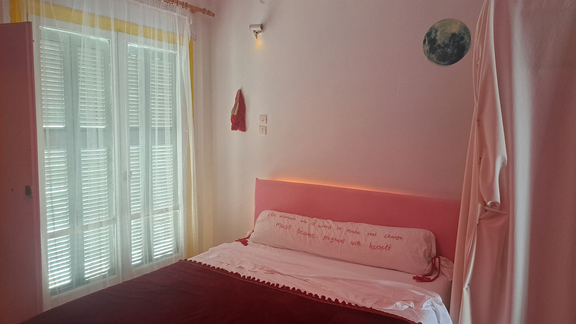 «Αυτό θέλω να κάνω με το δωμάτιο. Να φτιάξω ένα χώρο αναστοχασμού (σ.σ. reflexion, εξ ου και οι πολλοί καθρέφτες) που όμως θα υπονοεί και τη διαδικασία αναγέννησης που ακολουθεί. Γιατί το τραύμα το κουβαλάς, αλλά αλλάζει, γίνεται κάτι καινούργιο». Οποια έχει περάσει από αυτή τη διαδικασία, όποιο κι αν ήταν το αποτέλεσμα, δύσκολα θα συγκρατήσει τα δάκρυά της μένοντας μόνη στο δωμάτιο, βλέποντας το κολάζ των τεκμηρίων της «α-γονιμότητας» στον τοίχο. Ομως μες στο μισοσκόταδο αχνοφέγγει η αισιοδοξία. Σε ένα μαξιλάρι η Αναστασία έχει κεντήσει τη φράση-έμπνευση της Ούρσουλα Λε Γκεν, «η γυναίκα που θέλει να κάνει αυτή την αλλαγή πρέπει να μείνει έγκυος με τον εαυτό της, επιτέλους».