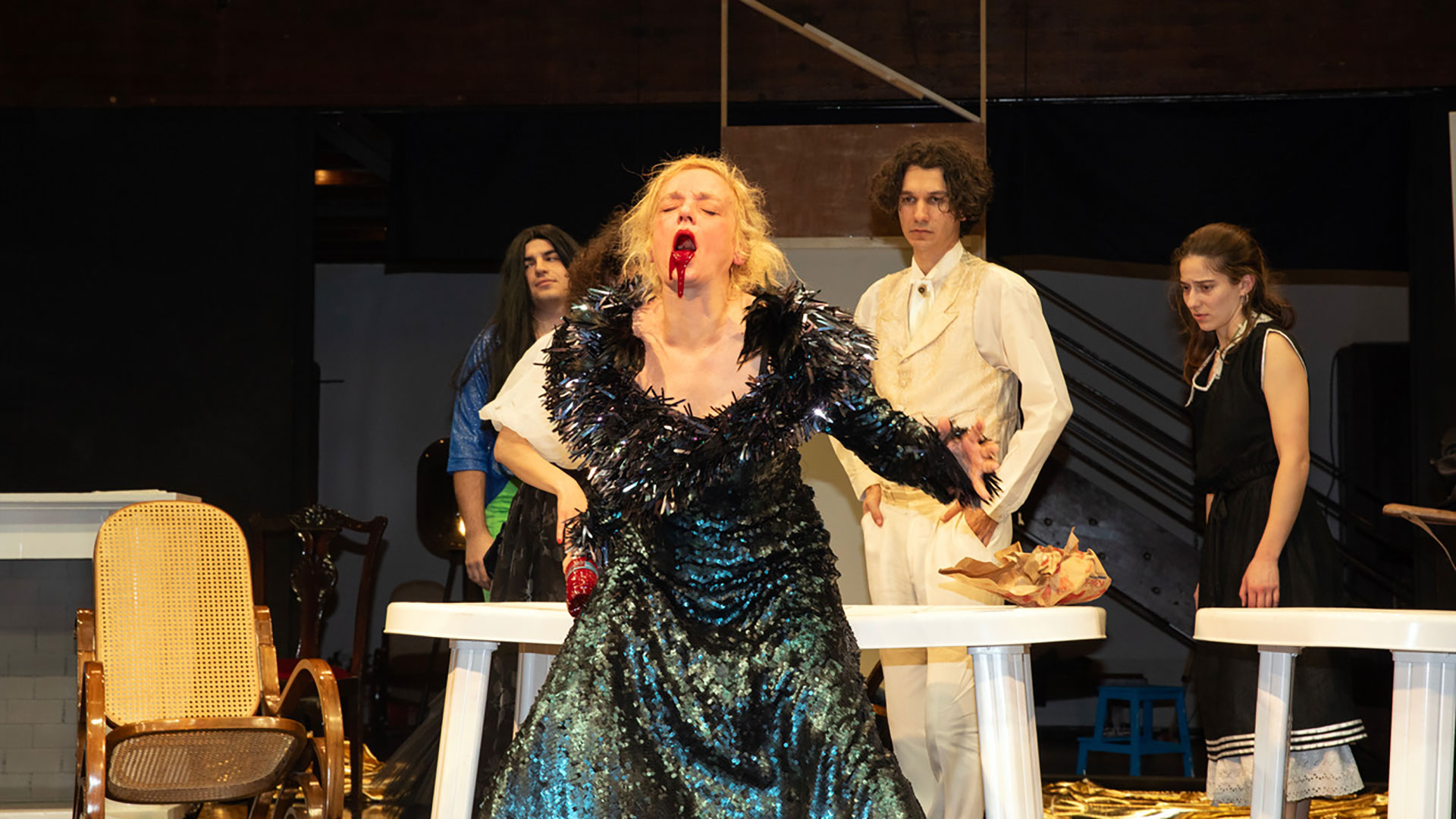 Η ίδια στον ρόλο της αλκοολικής Μάσα σέρνεται στη σκηνή με βλέμμα απλανές, αυνανίζεται, χασμουριέται και ξερνάει αίμα στο άκουσμα του «Εθνικού Θεάτρου», του «Χουβαρδά», του «Μοσχόπουλου».