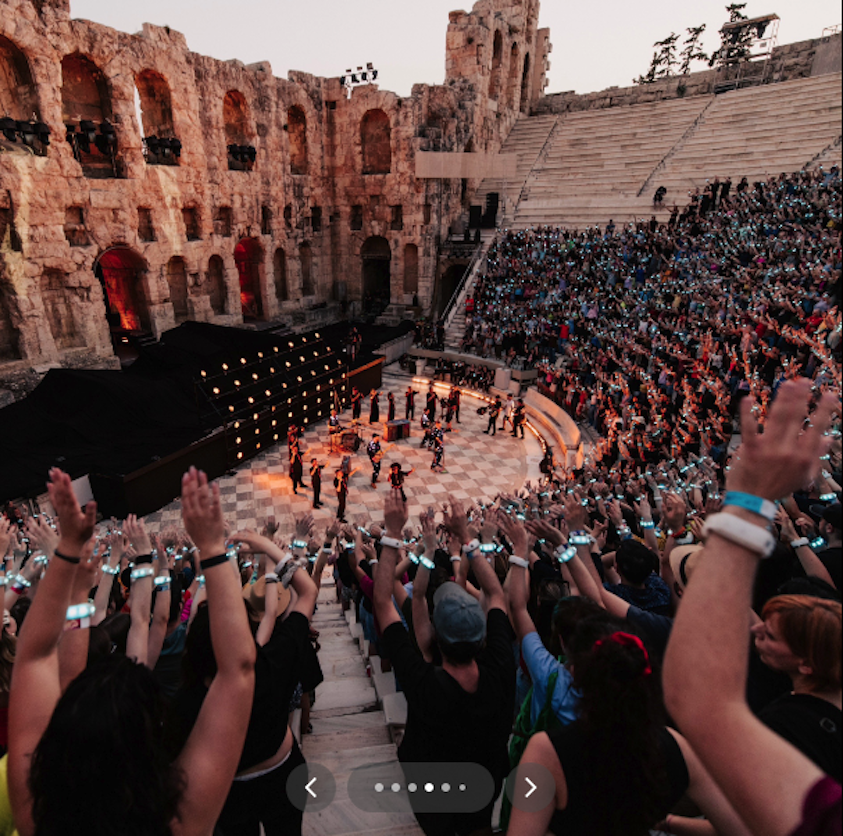 Μέσα στο αρχαίο θέατρο το συγκρότημα φοράει τζάκετς με φωτάκια που αναβοσβήνουν και εμείς έχουμε χρωματιστά φωτεινά βραχιόλια και στα δύο μας χέρια. Οσο ο ήλιος δύει, ο ουρανός φωτίζεται από τους Coldplay και οι περαστικοί έξω από το Ηρώδειο στέκονται για να δουν την πανδαισία χρωμάτων που σχηματίζεται και να ακούσουν τη μουσική. Δεν έχουμε επικοινωνία με τον έξω κόσμο καθώς ήμασταν υποχρεωμένοι να αφήσουμε νωρίτερα τα κινητά μας τηλέφωνα σε ένα ασφαλές σημείο προκειμένου να μη διαρρεύσουν εικόνες και βίντεο από τα γυρίσματα – αν και δεν το απέφυγαν τελικά. Ωστόσο εμείς περιμέναμε υπομονετικά στην ουρά έξω από το κηποθέατρο «Δόρα Στράτου» για να περάσουμε τους ελέγχους, να βάλουμε τα τηλέφωνά μας σε ειδικά σακουλάκια και να περπατήσουμε μέσα στον δυνατό ήλιο για να βρεθούμε κοντά στο αγαπημένο μας συγκρότημα. Κάποιοι τραγουδούν το «Viva La Vida», ενώ άλλοι παραπονιούνται που θα μείνουν για λίγο μακριά από τα κινητά τους τηλέφωνα. Δεν φαίνεται όμως να τους έλειψαν όταν το συγκρότημα έδωσε το έναυσμα της μουσικής γιορτής.