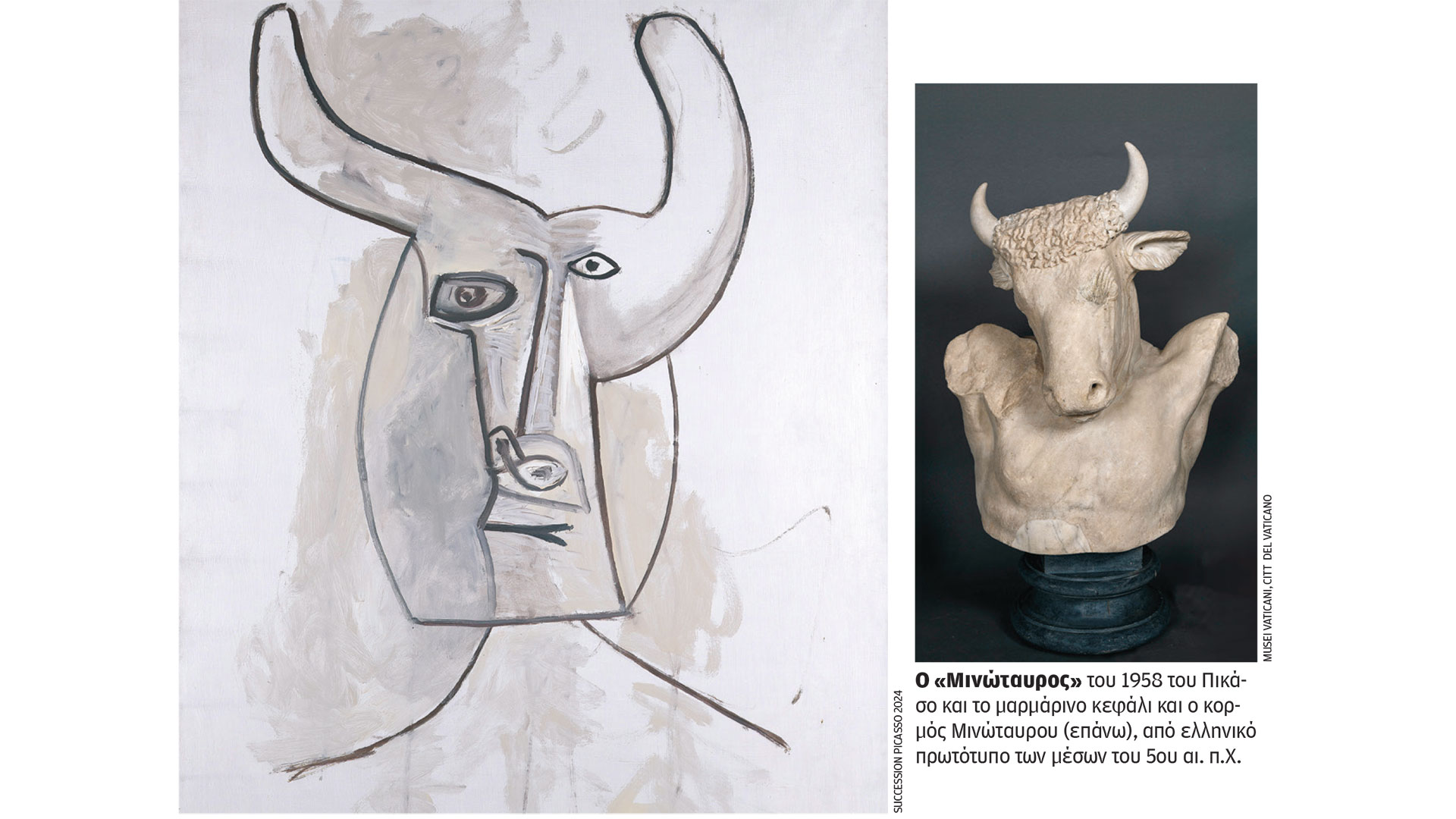 Στο μουσείο μας υποδέχεται μια μαρμάρινη προτομή Μινώταυρου από ελληνικό πρωτότυπο των μέσων του 5ου αιώνα π.Χ. από τα μουσεία του Βατικανού. Η έκφραση του αγάλματος είναι αινιγματική, μοιάζει σαν να μας περιπαίζει. Δίπλα του ο διευθυντής του Μουσείου Ακρόπολης, ανασκαφέας της Ελεύθερνας και ιδρυτής του μουσείου της, τοποθέτησε έναν Μινώταυρο σε λάδι του 1958, με σφιγμένα χείλη και μελαγχολικό βλέμμα. «Ο Πικάσο εξανθρώπισε τον Μινώταυρο, τον έδειξε ερωτικό, τραυματισμένο, ακόμη και πάσχοντα», εξηγεί. Η ιδέα μιας έκθεσης όπου τα έργα του Ισπανού μοντερνιστή θα αντιπαραβάλλονταν με ανασκαφικά ευρήματα από την Ελεύθερνα τριγυρνούσε στο μυαλό του πολύ πριν από την κατασκευή του μουσείου. Ο Μινώταυρος βέβαια δεν μπορούσε να είναι το κεντρικό θέμα, το καταλάβαιναν και οι δύο επιμελητές και φίλοι, γιατί αυτό θα τους απομάκρυνε από την Ελεύθερνα.