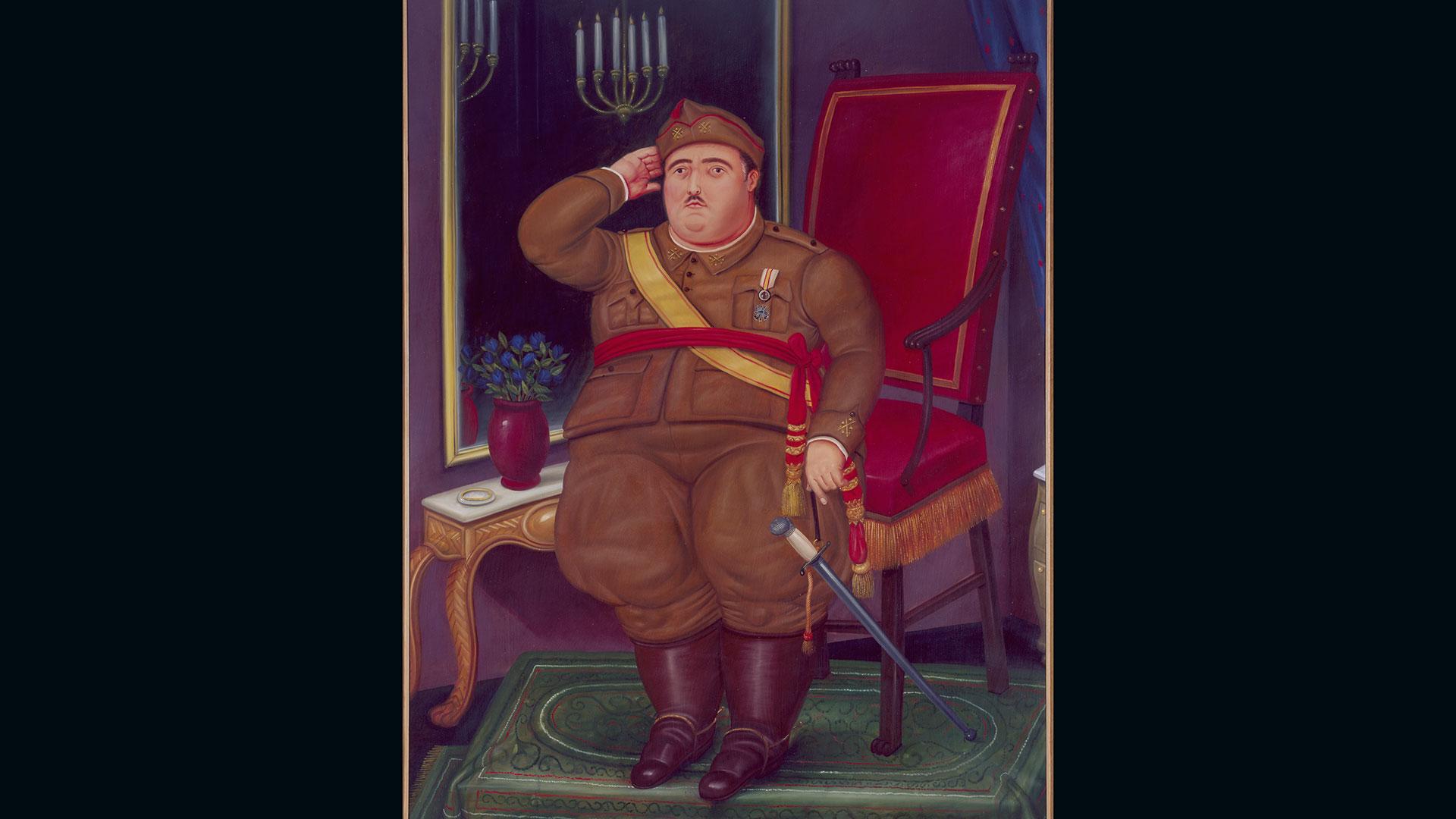 Η σκέψη γεννήθηκε μέσα μου κατ’ αρχάς με αφορμή το ξεκαρδιστικό πορτρέτο του Φράνκο από τον Ισπανό ζωγράφο Φερνάντο Μποτέρο, ως καρικατούρα ενός κοντόχοντρου ανθρωπάκου που κορδώνεται μέσα στη στρατιωτική στολή του και χαιρετά μια φανταστική παρέλαση, το οποίο έχει αναρτηθεί πολύ κοντά στην είσοδο του εκθεσιακού χώρου. Στην προσωπογραφία είναι αναγνωρίσιμο το εικαστικό ιδίωμα του πασίγνωστου καλλιτέχνη, ο οποίος καταφέρνει να απεικονίσει το πρόσωπο του εχθρού με τρόπο ώστε να είναι σαφής η αντίθεση του στο φρανκικό καθεστώς.