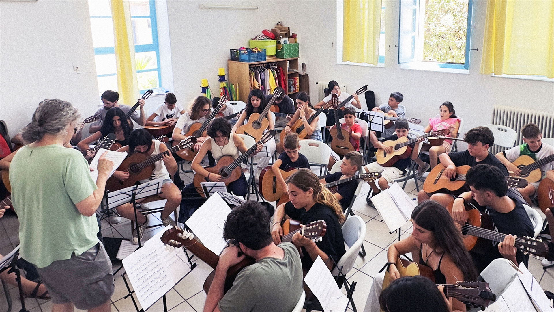 Εικόνα δεύτερη: Το Νηπιαγωγείο Αρτεμώνα μοιάζει με πολύβουη κυψέλη, καθώς είναι γεμάτο παιδιά. Αλλα μελετούν τις παρτιτούρες τους, άλλα κάνουν πρόβα με τις κιθάρες τους, ένας πιτσιρικάς παίζει φυσαρμόνικα. Στις αίθουσες, οι δάσκαλοι μουσικής ετοιμάζονται για τα μαθήματα. Κάποιοι γονείς παρακολουθούν διακριτικά καθισμένοι στα πεζούλια του κήπου. Οπως ο καπετάνιος Μανώλης Νικολάκης, που έχει έρθει από την Κάσο συνοδεύοντας τους δίδυμους γιους του. Και η συντοπίτισσά του Σοφία Ζούλη, δικηγόρος, που επίσης ταξίδεψε στη Σίφνο με την κόρη και τον γιο της. Και τα τέσσερα παιδιά παρακολουθούν δωρεάν μαθήματα κλασικής μουσικής στο νησί τους χάρη στον Σύνδεσμο «Οι Φίλοι του Ελληνικού Νησιού και της Θάλασσας». Η Αλίκη Νταή, υπεύθυνη των μουσικών εργαστηρίων, περιγράφει πώς λειτουργεί αυτή η… σκυταλοδρομία αγάπης για τη μουσική και την τέχνη γενικότερα στο Αιγαίο. «Σήμερα έχουμε τριακόσιους μαθητές σε Σίφνο, Σέριφο, Ικαρία, Λήμνο, Κέα και Κάσο. Και δεκαοκτώ δασκάλους που ταξιδεύουν σε αυτούς τους προορισμούς όλο τον χρόνο, δύο φορές τον μήνα, για να διδάξουν τα παιδιά κιθάρα, πιάνο, φλογέρα, φλάουτο, βιολί, χορωδία, μουσικοκινητική, χορό. Ισως ακούγεται απλό, αλλά δεν είναι. Σκεφτείτε τις κακοκαιρίες του χειμώνα, τις αλλαγές ή ματαιώσεις ακτοπλοϊκών και αεροπορικών δρομολογίων, τα απαγορευτικά απόπλου. Οι συνεργάτες μας πρέπει να είναι… ετοιμοπόλεμοι, αφού συχνά καλούνται να βρουν λύσεις ώστε να μη χαθεί το μάθημα. Τα παιδιά τούς περιμένουν με λαχτάρα. Ακόμη και την περίοδο της πανδημίας, δεν σταματήσαμε ούτε μία μέρα, η διδασκαλία γινόταν διαδικτυακά».