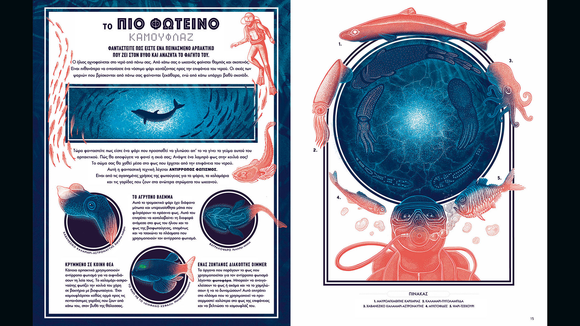 Tο σκοτάδι, πάντως, εξακολουθεί να φωλιάζει απρόσιτο στον βυθό των ωκεανών κι έτσι βρίσκουν την ευκαιρία να λάμψουν εκεί πλάσματα με απίθανα ονόματα, όπως «τριχωτός μαύρος διάβολος της θάλασσας». Αυτός ο πολύ τρομακτικός τύπος «έχει μια μακριά λεπτή κεραία στο κεφάλι του – σαν καλάμι ψαρέματος μ’ ένα φως δεμένο στην άκρη του. Μπορεί να κουνηθεί προς όλες τις κατευθύνσεις και να ταλαντευτεί προκειμένου να παρασύρει το θήραμα του Μαύρου Διαβόλου». Για να μην πούμε για τον πανούργο «οφιουροειδή», κοντινό συγγενή του αστερία: «Οταν δέχεται επίθεση, ξεφεύγει θυσιάζοντας ένα απ’ τα άκρα του. Το ξεκολλάει επίτηδες και το αρπακτικό ξεγελιέται και ακολουθεί το άκρο, το οποίο συνεχίζει να αναβοσβήνει μόνο του, όσο ο οφιουροειδής ξεφεύγει». Εδώ ταιριάζει πραγματικά η φράση «δεν περιγράφω άλλο».