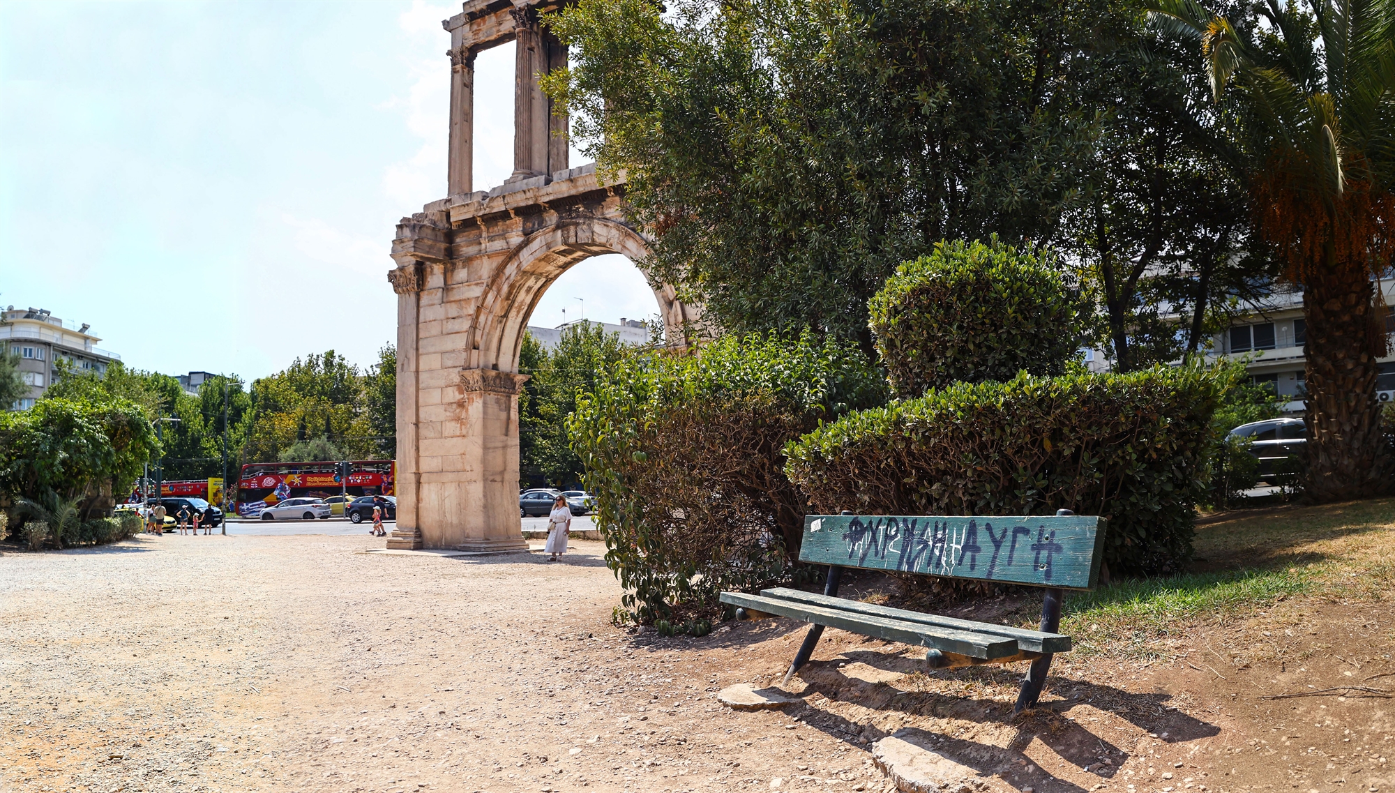 Είναι σαφές ότι τα παγκάκια δίπλα στην Πύλη του Αδριανού δεν προσφέρονται για ξεκούραση. Αλλωστε, οι περισσότεροι τουρίστες τα προσπερνούν (ευτυχώς) γιατί έχουν στον νου να βγάλουν φωτογραφίες με φόντο την Πύλη προς την οδό Αμαλίας. Ισορροπούν πάνω στα χοντρά και ανακατεμένα λευκά χαλίκια μέσα στο λιοπύρι του Αυγούστου και δεν είναι σε θέση, όπως πιθανολογεί κανείς, να μεταφράσουν τα συνθήματα πάνω στα ταλαίπωρα και ξεχαρβαλωμένα παγκάκια του σύγχρονου αθηναϊκού πολιτισμού.