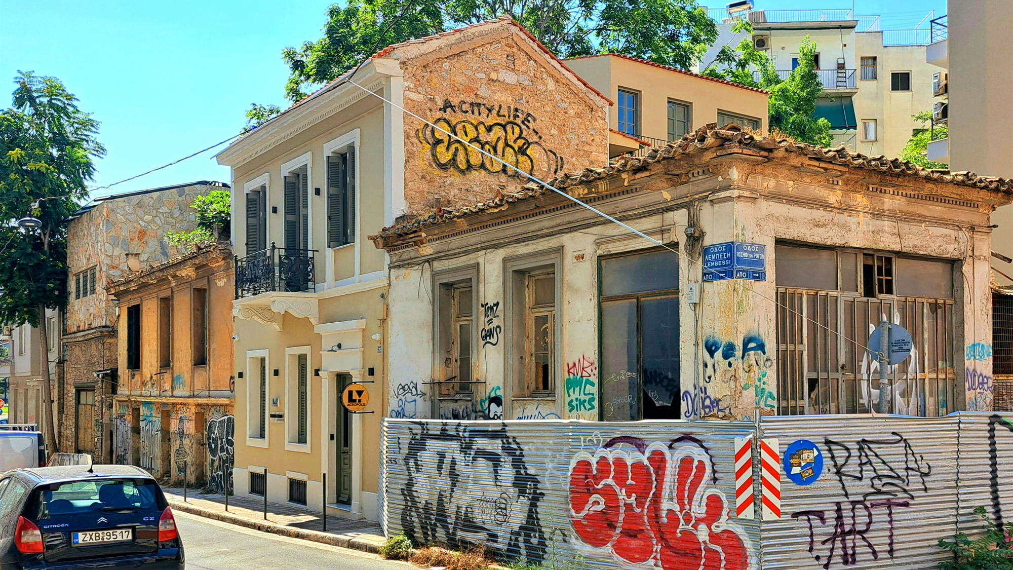 Είχα βγει πάλι στη Συγγρού, αλλά έστριψα δεξιά στη Λεμπέση. Αυτή η διαδρομή οδηγεί σε μια βαθιά αστική εμπειρία καθώς στη γωνία με την οδό Ιωσήφ των Ρωγών διασώζεται μια συστάδα παλαιών σπιτιών που μας δείχνουν ακριβώς την όψη που είχε η γειτονιά ώς τον πόλεμο. Είναι μια θέα σαν ξεκομμένη από ένα νοερό άλμπουμ αναμνήσεων. Κολλημένα τα μικρά σπίτια μεταξύ τους, διώροφα και μονώροφα, κεραμοσκεπή, δένουν σε έναν ιστό πυκνό και τόσο χαρακτηριστικό της παλιάς αθηναϊκής γειτονιάς.