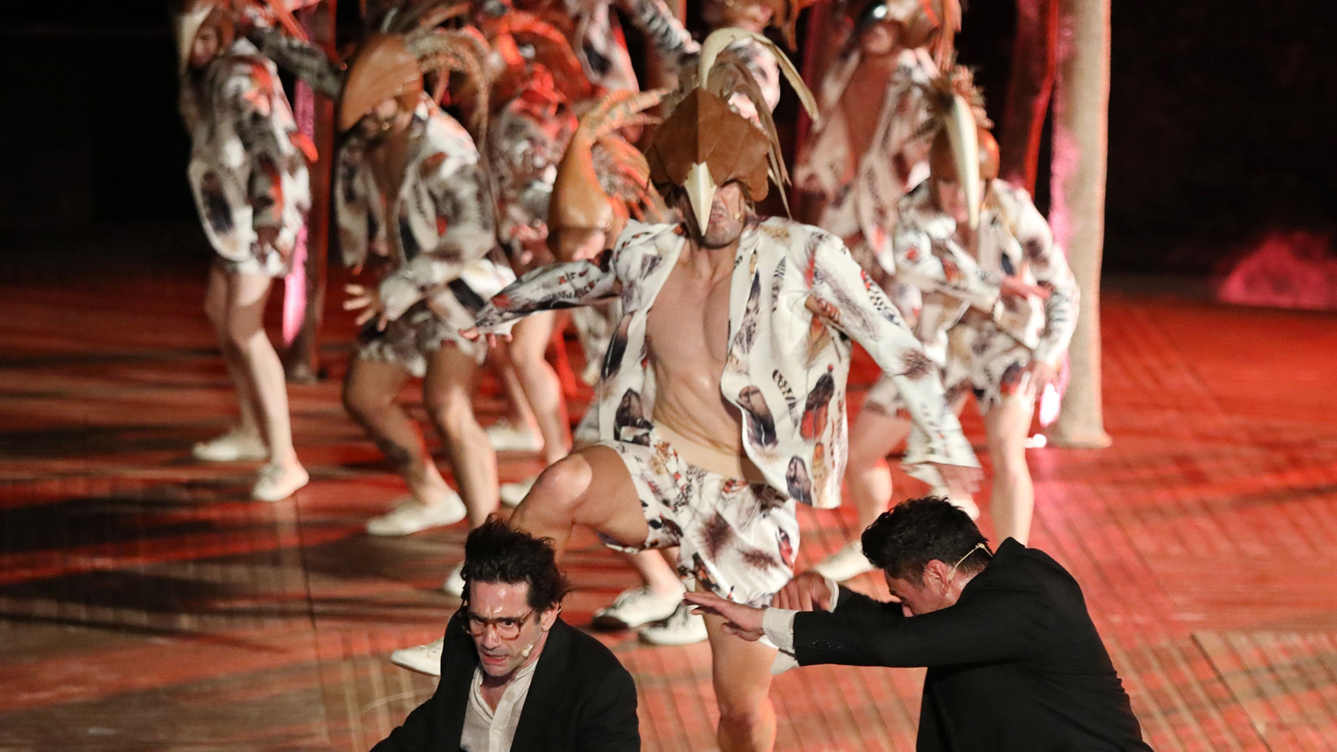 Το τελευταίο μέρος της παράστασης έχει μια πιο τελετουργική αύρα. Οι μουσικές συνθέσεις του Αλέξανδρου Δράκου Κτιστάκη –ίσως έχει βάλει και ο ίδιος ο Μπινιάρης λίγο το χεράκι του– δημιουργούν τη συγκεκριμένη ατμόσφαιρα, σε συνδυασμό με τις στοχευμένες αντηχήσεις, τους ψιθύρους και το ξεχωριστό ηχόχρωμα του χορού. Ο τελευταίος απογειώνει πραγματικά ένα από τα τραγούδια του, που ανακαλεί έντονα τόσο σε ρυθμό όσο και σε νόημα το «Αιρετικό» του Γιάννη Αγγελάκα. Τα κοστούμια και τα σκηνικά (λιτά) από τον Πάρι Μέξη αποτελούν επίσης πάντρεμα αρχαιοπρεπών και σύγχρονων τάσεων: μοδάτα ασορτί σύνολα για τον χορό και ολόσωμες φόρμες για τους θεούς-απεσταλμένους, οι οποίες όμως συμπληρώνονται από ευμεγέθεις μάσκες με ανάγλυφα μοτίβα. Γενικώς ο Μπινιάρης και οι συνεργάτες του κέρδισαν το στοίχημα της Επιδαύρου και του Αριστοφάνη, γεγονός που φάνηκε και από το απλόχερο χειροκρότημα του πλήθους που γέμισε το αρχαίο θέατρο – το διπλό sold out Παρασκευής και Σαββάτου έγραψε συνολικά 18.400 θεατές. Πλέον η παράσταση ξεκινάει περιοδεία ανά την επικράτεια με πρώτο σταθμό την Αρχαία Ολυμπία στις 18 Αυγούστου.