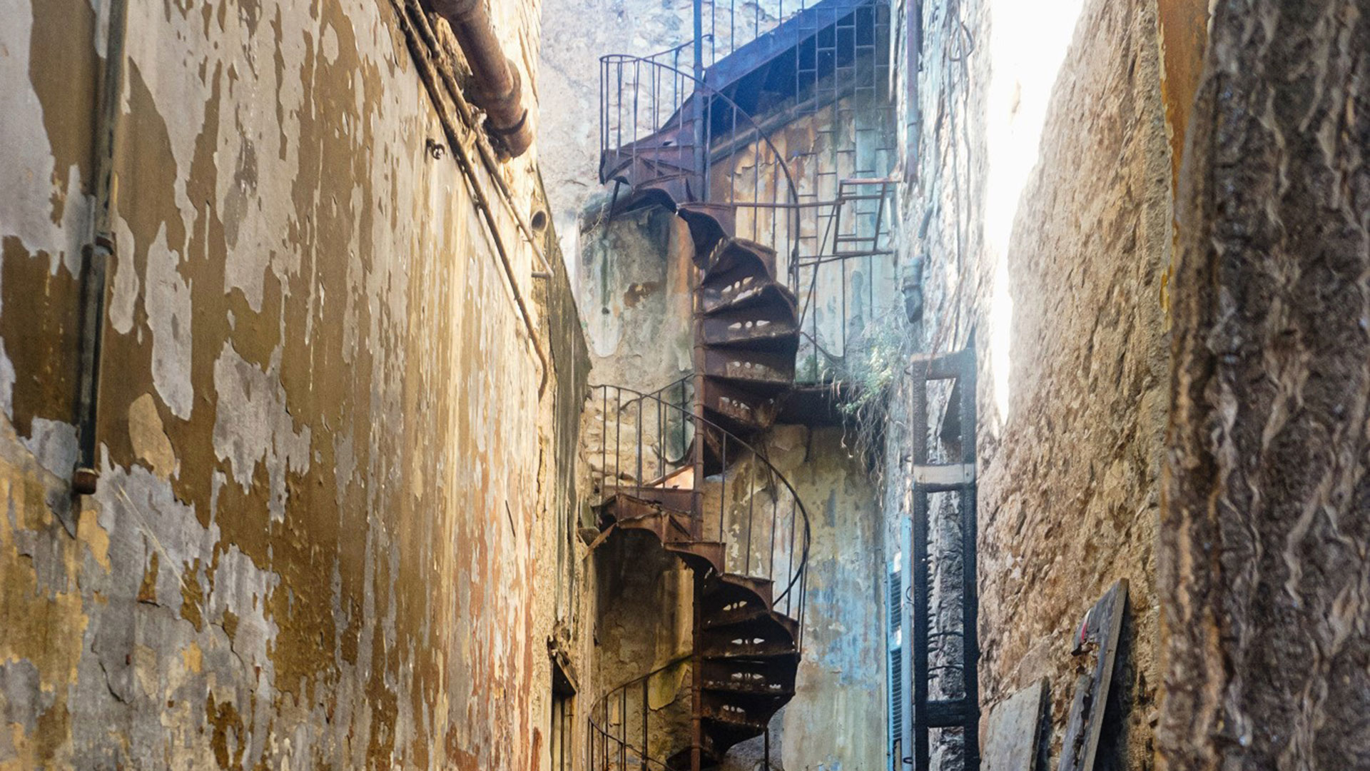 Αυτή η θαυμάσια, σιδερένια, στριφογυριστή σκάλα της φωτογραφίας μας βρίσκεται στην οδό Πουλοπούλου στο Θησείο. Ανεβαίνει στον ουρανό σαν κλίμακα της ζωής. Μοιάζει με σκηνικό ενός θεατρικού έργου του Αρθουρ Μίλερ, θα μπορούσε να επενδύεται με μουσική υπόκρουση το «West Side Story». Αλλά βρίσκεται εκεί, στο Θησείο, σε αυτήν την τόσο παλιά συνοικία της Αθήνας, σε μια αυλή που για να τη δεις πρέπει να θέλεις να την εντοπίσεις. Γι’ αυτό η αστική περιπλάνηση μοιάζει τόσο πολύ σαν αχαρτογράφητη πλοήγηση.