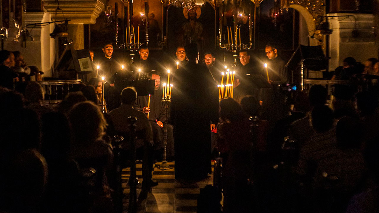 Οταν ο ύμνος ολοκληρώθηκε, οι έντεκα χορωδοί της MusicAeterna Byzantina, με έδρα την Κύπρο, εισήλθαν ντυμένοι με μαύρα ράσα από την κύρια είσοδο και κατευθύνθηκαν με τη βοήθεια κεριών στις θέσεις τους στο κέντρο του ναού. Ακολούθησε ο Μέγας Χερουβικός Υμνος του Πέτρου Λαμπαδαρίου. Κατά την ερμηνεία ακούστηκε το πρώτο «Τε Ρι Ρεμ», ένα περίτεχνο και έντονα ρυθμικό «κράτημα» του ίδιου συνθέτη (1777). Τα μέλη της χορωδίας παρακολουθούν τα μάτια και τις εκφράσεις του Αντώνιου Κουτρουπή, μαέστρου, επιστήθιου φίλου και σταθερού συνεργάτη επί 24 χρόνια του Θεόδωρου Κουρεντζή. Ανταποκρίνονται στις χορευτικές κινήσεις των χεριών του, στην ένταση του προσώπου του, στις παύσεις. «Μόνο για το Χερουβικό χρειαστήκαμε τέσσερις μήνες για να το εντάξουμε στο ρεπερτόριό μας, δουλεύαμε νότα νότα», εξηγεί ο μαέστρος, απόφοιτος του φημισμένου Κονσερβατορίου της Αγίας Πετρούπολης και επί πέντε χρόνια Πρωτοψάλτης στον Μητροπολιτικό Ναό Αγίου Γεωργίου στη Βενετία. Η βυζαντινή χορωδία συστήθηκε στο κοινό το 2019, δεκαπέντε ολόκληρα χρόνια από τη δημιουργία της πρώτης χορωδίας της MusicAeterna, έπειτα από συζήτηση που είχαν οι δύο φίλοι γύρω από τη βυζαντινή μουσική. «Ο Θοδωρής παραδέχεται τη βυζαντινή μουσική ως αυτόνομο μουσικό είδος, την έχει μελετήσει και ήθελε αυτόν τον πλούτο, δηλαδή την ένταξη των αρχαίων ήχων στις βυζαντινές ψαλμωδίες, να τον παρουσιάσουμε σε ευρωπαϊκά ακροατήρια», μας λέει. Για τον ίδιο η βυζαντινή παράδοση διαφέρει από τη δυτική λατρευτική μουσική κυρίως ως προς τη στόχευσή τους. «Η ευρωπαϊκή μουσική προάγει τον συνθέτη· αντίθετα, η ανατολική, ορθόδοξη παράδοση αναδεικνύει το θρησκευτικό μεγαλείο και δίνει όλες τις πληροφορίες στον πιστό για να μπορέσει να προσευχηθεί. Η μουσική πλαισιώνει τον στίχο, στη δυτική μουσική δεν είναι ξεκάθαρο τι ακούς», σημειώνει, επισημαίνοντας βέβαια ότι η δική τους χορωδία ψάλλει ύμνους που πλέον δεν ακούγονται σε Λειτουργίες.