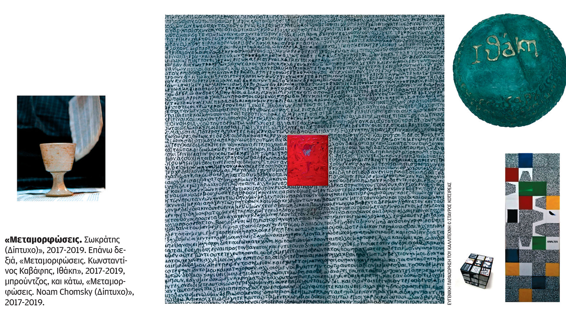 Η πρώτη παρουσίαση της εγκατάστασης «Μεταμορφώσεις» του Ελληνα καλλιτέχνη δίπλα στα χαρακτηριστικά κολάζ του Μπλέικ δίνει νέες δυνατότητες ερμηνείας τους. Παράλληλα, προσκαλεί το κοινό να συμβάλλει στη δημιουργία ενός νέου αφηγήματος για την εποχή μας. Το έργο αφήνει τον θεατή να αποκρυπτογραφήσει τα μηνύματα που κρύβονται στα αντικείμενα που παρατίθενται πάνω σε ένα μοναστηριακού τύπου τραπέζι μήκους 10 μέτρων. Ποιες πλευρές της προσωπικότητας και του έργου του Σωκράτη, του Ομήρου, του Σαίξπηρ, του Μότσαρτ, του Κομφούκιου, του Καβάφη, της Σιμόν ντε Μποβουάρ, του Μάρτιν Λούθερ Κινγκ, του Νόαμ Τσόμσκι θα τους έκαναν ομοτράπεζους σε μια φανταστική συνάθροιση;