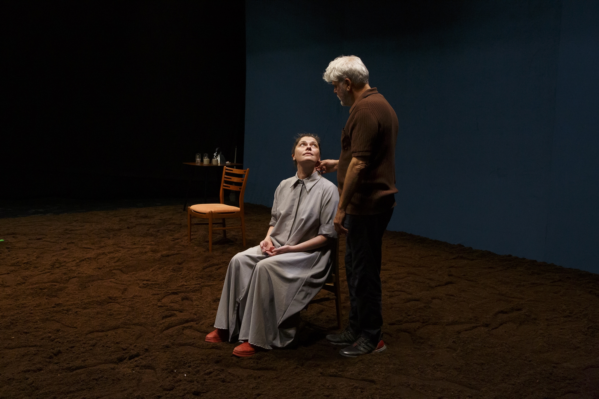 Η πρόβα που παρακολούθησε η «Κ» ξεκίνησε νωρίς το απόγευμα της περασμένης Παρασκευής και θα συνεχιζόταν έως αργά το βράδυ. Η Αργυρώ Χιώτη, που συνεργάζεται με τον Τιάγκο Ροντρίγκες στη σκηνοθεσία, «ενορχήστρωνε» τεχνικούς και ηθοποιούς κι εμείς καθίσαμε στην πρώτη σειρά: το δάπεδο της σκηνής καλυμμένο από χώμα, στο βάθος αριστερά ένα τραπέζι με δύο καρέκλες. «Ησυχα, μαλακά, όποτε θέλετε αρχίζουμε», λέει η σκηνοθέτις. Ο Νίκος Καραθάνος στέκεται δίπλα στη Μαρίσσα Τριανταφυλλίδου και κοιτάζοντάς μας κατά πρόσωπο, αρχίζουν με το πρώτο «τραγούδι» από τα τέσσερα που διαρθρώνουν την παράσταση.
