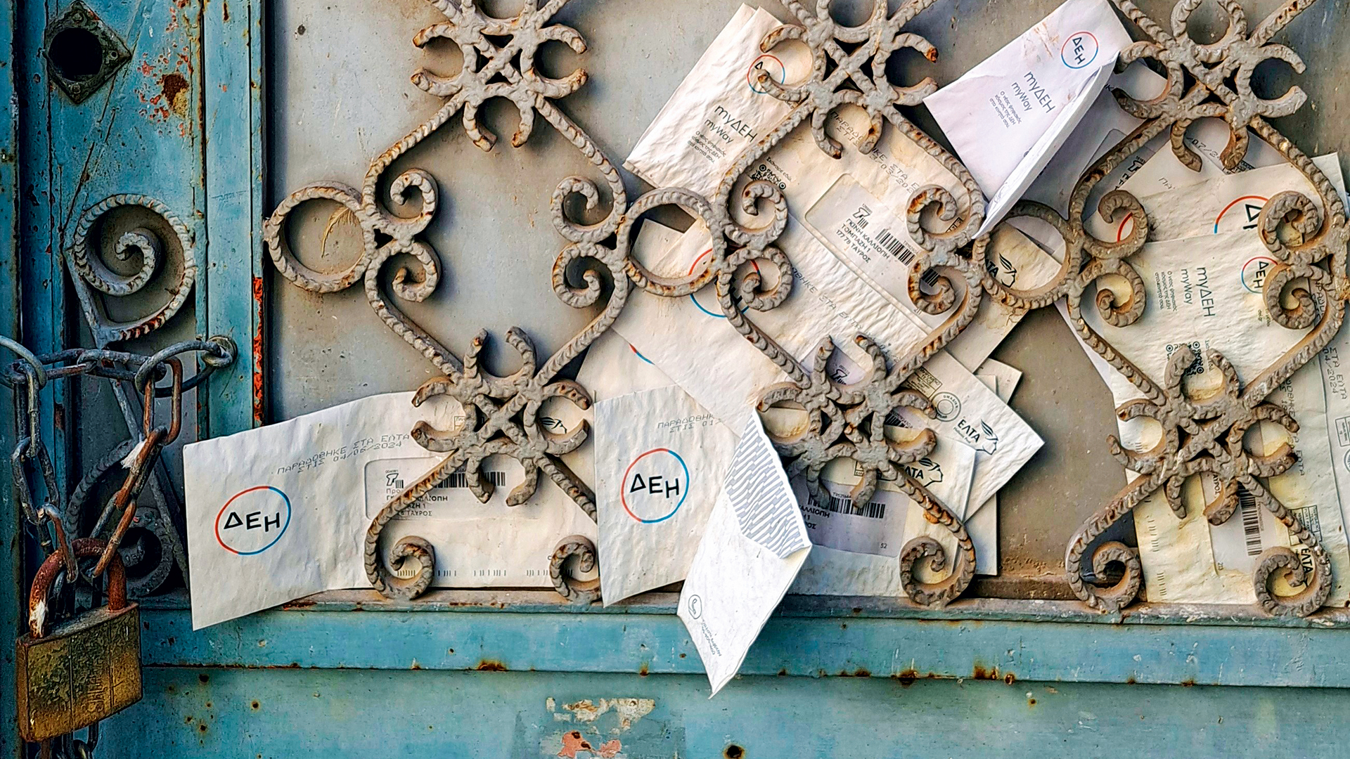 Αλλά, κοντά στον σταθμό θα βρεις ανάμεσα στις μεγάλες αστικές, πλέον, πολυκατοικίες, τα αναπάντεχα μικρά ξέφτια του χθες. Υπάρχει αυτή η πόρτα στην αρχή της οδού Τομπάζη, λουλουδιασμένη στη μαντεμένια ανθοφορία της, που μοιάζει με εικαστική εγκατάσταση γεμάτη με ανεπίδοτους λογαριασμούς. Φάκελοι, σκονισμένοι και φθαρμένοι, χωμένοι ανάμεσα στα σιδερένια στολίδια… Κάποιες ζωές έχουν αποδράσει… Και δίπλα, τα σιδερένια ρολά της παλιάς αποθήκης, από μόνα τους απομεινάρια ενός τεχνολογικού πολιτισμού που δεν συγκινεί πια, δεν ενδιαφέρει και έχει αφεθεί να ρημάζει…