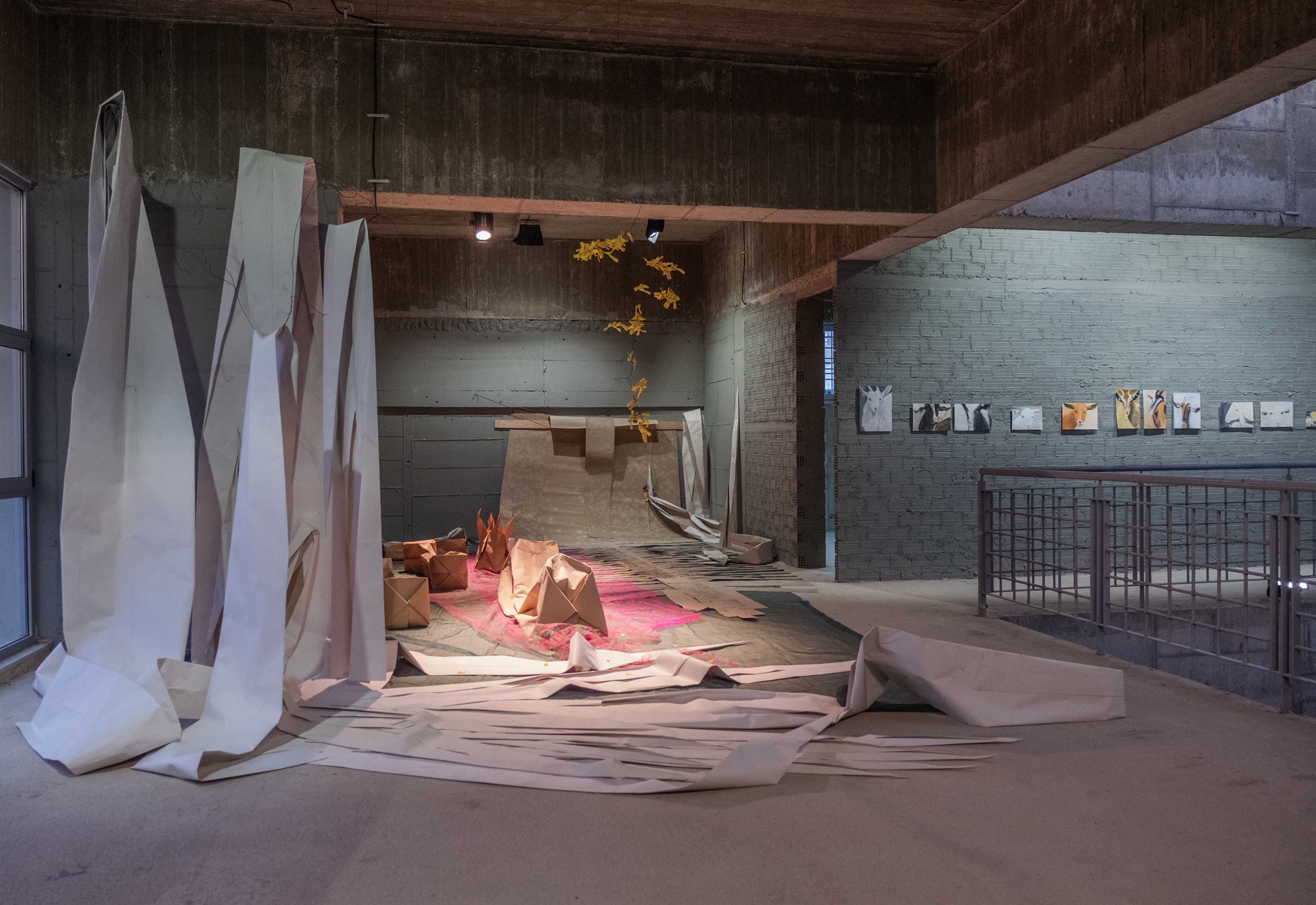 Εκεί λοιπόν βρεθήκαμε ένα απόγευμα Σαββάτου, και δυο βήματα από τον σταθμό του μετρό Χαλανδρίου ακούσαμε το μουρμουρητό αρχαίων υδάτων να «ανεβαίνει» από το ξερό χώμα. Η ηχητική εγκατάσταση «Water Voices» των Latent Community που ξεκίνησε με ηχογραφήσεις πεδίου από την Αλεξάνδρεια της Αιγύπτου, είναι το πρώτο έργο της έκθεσης, τοποθετημένο εκεί όπου στα χιμαιρικά σχέδια υπήρχαν δύο τεχνητές λίμνες με ψάρια κόι. Στόχος των δημιουργών είναι να συνδέσουν υδάτινες αναμνήσεις και παρουσίες από διαφορετικούς μεσογειακούς τόπους και χρόνους.