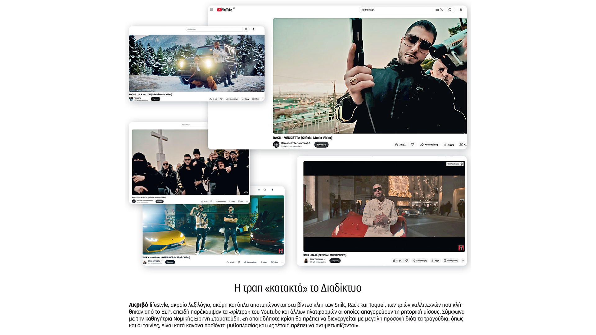 Χθες κλήθηκαν σε ακρόαση τρεις τράπερ από το Εθνικό Συμβούλιο Ραδιοτηλεόρασης, το οποίο είναι αρμόδιο, εκτός των άλλων, και για τον έλεγχο του οπτικοακουστικού περιεχομένου που αναρτάται στο Διαδίκτυο. Πρόκειται για τους καλλιτέχνες Snik, Toquel και Rack, μαζί με τις δισκογραφικές εταιρείες Capital Music, Alphapop Records και Mad House Records· όλοι τους ελέγχονται με βάση τον νόμο 4779/2021 περί «προβολής περιεχομένου που θίγει την ηθική και πνευματική ανάπτυξη των ανηλίκων», «υποκίνησης σε βία και μίσος» και «προβολής περιεχομένου χωρίς την εγγραφή του στο μητρώο του ΕΣΡ για τις νέες υπηρεσίες οπτικοακουστικών μέσων».