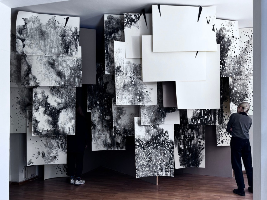 Συνεχίζεται η έκθεση της Κατερίνας Στεφανιδάκη στην γκαλερί Ζουμπουλάκη, όπου η καλλιτέχνις τοποθετεί την εγκατάσταση «Safe Ground» (φωτογραφία), η οποία αποτελείται από τρισδιάστατες επιφάνειες κατασκευασμένες από χαρτί, κάρβουνο και ξύλο.Οι επιφάνειες αυτές έχουν το ύψος της γκαλερί, ενώ δημιουργούν σύντομες, δαιδαλώδεις διαδρομές, τις οποίες οι επισκέπτες καλούνται να ακολουθήσουν. Στις 10 π.μ. – 4 μ.μ., Κριεζώτου 6.