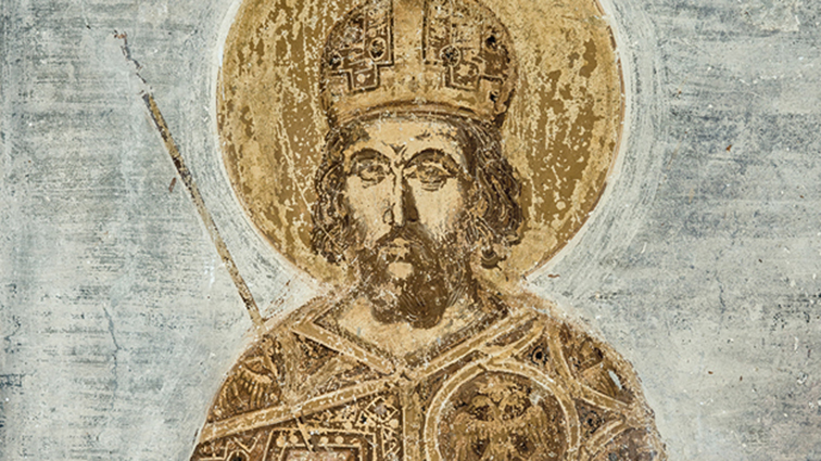 Οπως αναφέρει η ανακοίνωση του ΥΠΠΟ, στην τοιχογραφία απεικονίζεται η μορφή ενός ώριμου άνδρα που φέρει αυτοκρατορικά «διάσημα» (πολυτελή λώρο πάνω από τον ανοιχτόχρωμο σάκκο, διάλιθο στέμμα) και κρατά σταυροφόρο σκήπτρο. Ο χρυσοκέντητος πορφυρός του μανδύας διακοσμείται με μετάλλια, στα οποία εγγράφονται δικέφαλοι αετοί με στέμμα ανάμεσα στις κεφαλές τους, διακριτικό των μελών της οικογένειας των Παλαιολόγων. Η παρουσία των δικέφαλων αετών στο ένδυμα της μορφής, σε συνδυασμό με τα υπόλοιπα insignia, αποτελούσε ένα εικονογραφημένο μήνυμα που επέτρεπε στον θεατή να ταυτοποιήσει αδιαμφισβήτητα τον άντρα με αυτοκράτορα.
