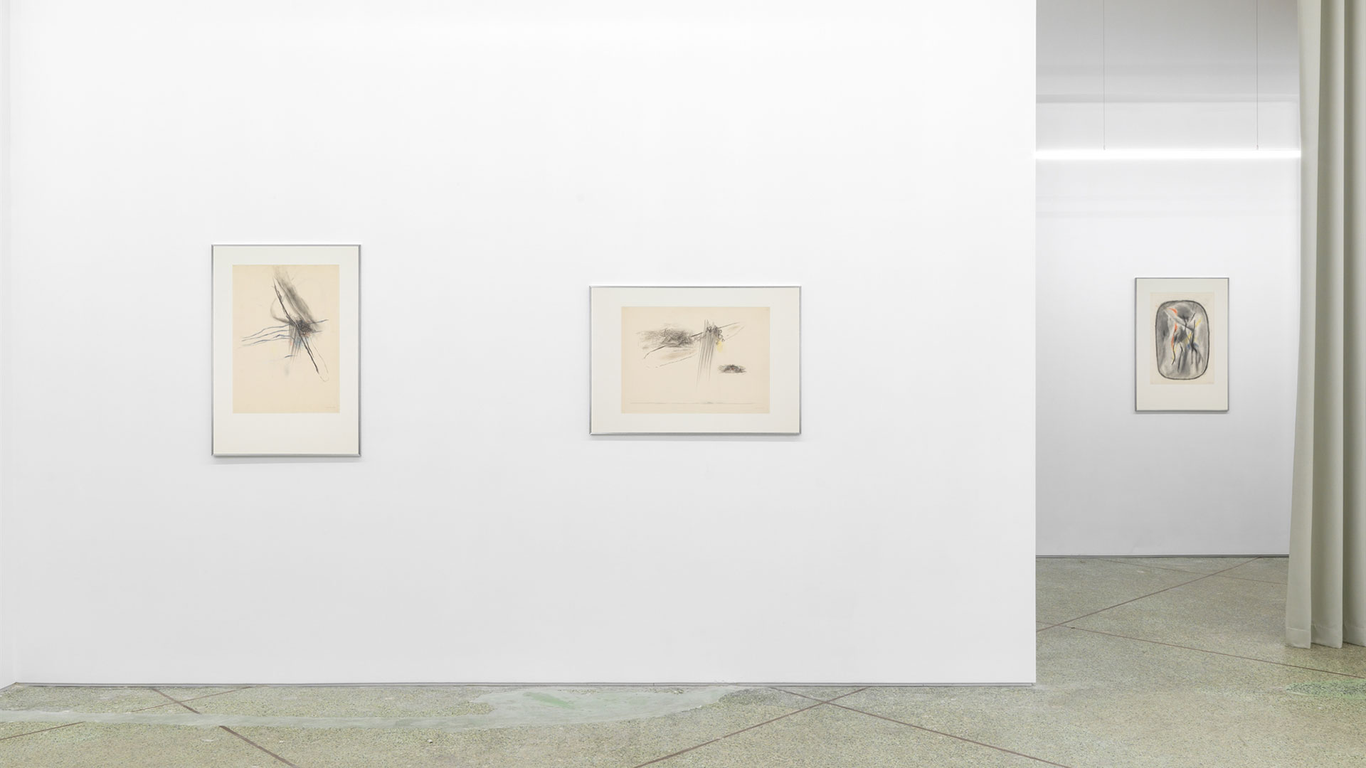 Τα ποιητικά έργα του Δημήτρη Κοντού (1931-1996), χειρονομιακά ψυχογραφήματα καθώς κοιτούσε τον συννεφιασμένο ουρανό στο Παρίσι του 1961, σχηματίζουν μια ζωφόρο στη νέα στέγη της CAN Gallery της Χριστίνας Ανδρουλιδάκη. Στην οδό Χαλκοκονδύλη 19, κοντά στην Ομόνοια, στον μεγάλο ισόγειο χώρο ενός κλασικότροπου μοντερνιστικού κτιρίου του 1954 με την υπογραφή του Σπύρου Στάικου (1913-2012), η Χριστίνα Ανδρουλιδάκη έχει οργανώσει εδώ και λίγους μήνες τον νέο χώρο της γκαλερί, αφήνοντας το Κολωνάκι και ορίζοντας νέες βάσεις στην καρδιά της εμπορικής Αθήνας. Υπάρχει μια βαθιά αίσθηση vintage αθηναϊκότητας, με την εντυπωσιακή σε έκταση «θάλασσα» από ένα πράσινο μωσαϊκό της Τήνου, που αποκαλύφθηκε έπειτα από αφαιρέσεις επιστρώσεων. Τώρα, γεμίζει το βλέμμα και πλημμυρίζει τις αισθήσεις. Η οροφή από γυμνό σκυρόδεμα σε ικανό ύψος (μετά την καθαίρεση ψευδοροφής) έχει μια θαυμάσια μελέτη φωτισμού της Μαρίας Μανέτα (με την εφαρμογή από τον Θανάση Καλκάνη της Lights On).
