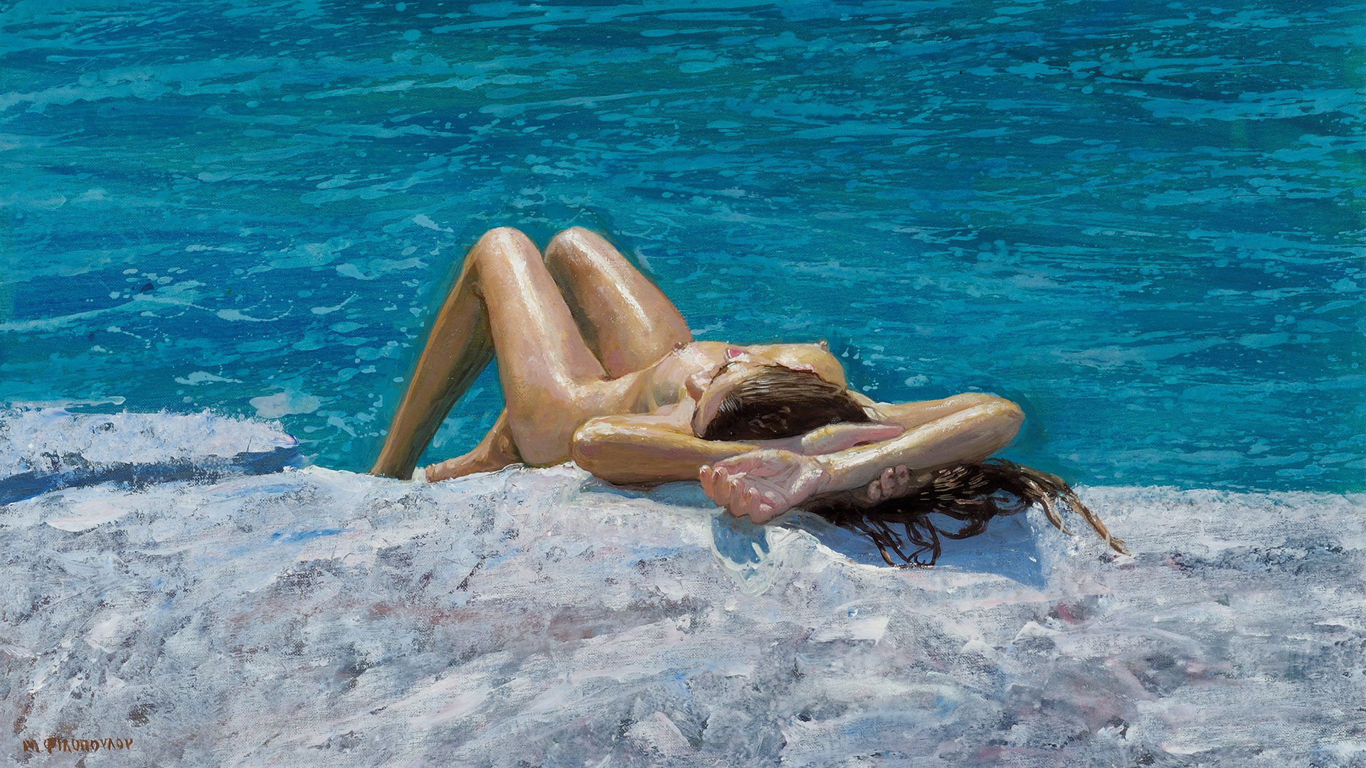 Μια ομολογουμένως όχι ενδελεχής αναζήτηση στις μόνιμες συλλογές της Εθνικής Πινακοθήκης αποφέρει μια αισθαντική ξυλογραφία σε κινεζικό χαρτί του Δημητρίου Γαλάνη, τα «Γυμνά σε τοπίο» (1919-1920), και ένα παλιότερο αλλά τολμηρό «Γυμνό», πίνακα του 1877 από τον Πολυχρόνη Λεμπέση. Και τα δύο έργα απεικονίζουν γυναικείες μορφές. Κάνοντας ένα άλμα στον χρόνο, η «Αυτοπροσωπογραφία» (2003) του Γιώργου Ρόρρη αποκαλύπτει στον θεατή την ιστορία ενός γυναικείου σώματος ανοιχτού στο βλέμμα, χωρίς ρούχα –έτσι περιγράφει ο Ρόρρης τα γυμνά του, βάζοντας σε δεύτερη μοίρα το ερωτικό στοιχείο–, μέσα από τη διαμεσολάβηση της ματιάς του ζωγράφου. Και αίφνης εμφανίζονται μπροστά μου οι «Κολυμβητές κάτω από το νερό» (2020) της Μαρίας Φιλοπούλου, ένας πίνακας μεγάλων διαστάσεων, με ανδρικά και γυναικεία σώματα να παίζουν ολόγυμνα και χαριτωμένα μέσα στον διάχυτο ερωτισμό μιας γαλανής θάλασσας. Δικαιωματικά λοιπόν σε αυτή τη συζήτηση για τη σχέση των Ελληνίδων παραστατικών ζωγράφων με την απεικόνιση της ερωτικής επιθυμίας η Μαρία Φιλοπούλου παίρνει πρώτη τον λόγο και ακολουθούν η Ειρήνη Ηλιοπούλου και η Μαρία Γιαννακάκη. Οι τελευταίες έχουν παρουσιάσει σχετικές ατομικές εκθέσεις, η πρώτη το 2019 με τίτλο «Ερωτικά» και η δεύτερη το 2020 με τίτλο «Ανοιξη τον χειμώνα». Οπως εύστοχα σχολίασε έμπειρος επιμελητής –και οι ίδιες παραδέχονται–, οι τρεις αυτές ζωγράφοι παρουσίασαν στο κοινό μια τέτοια σειρά έργων όταν είχαν την καλλιτεχνική δύναμη να τα υποστηρίξουν, γνωρίζοντας συνειδητά ή ασυνείδητα ότι θα κρίνονταν αυστηρά από το κοινό – ανδρικό και γυναικείο.