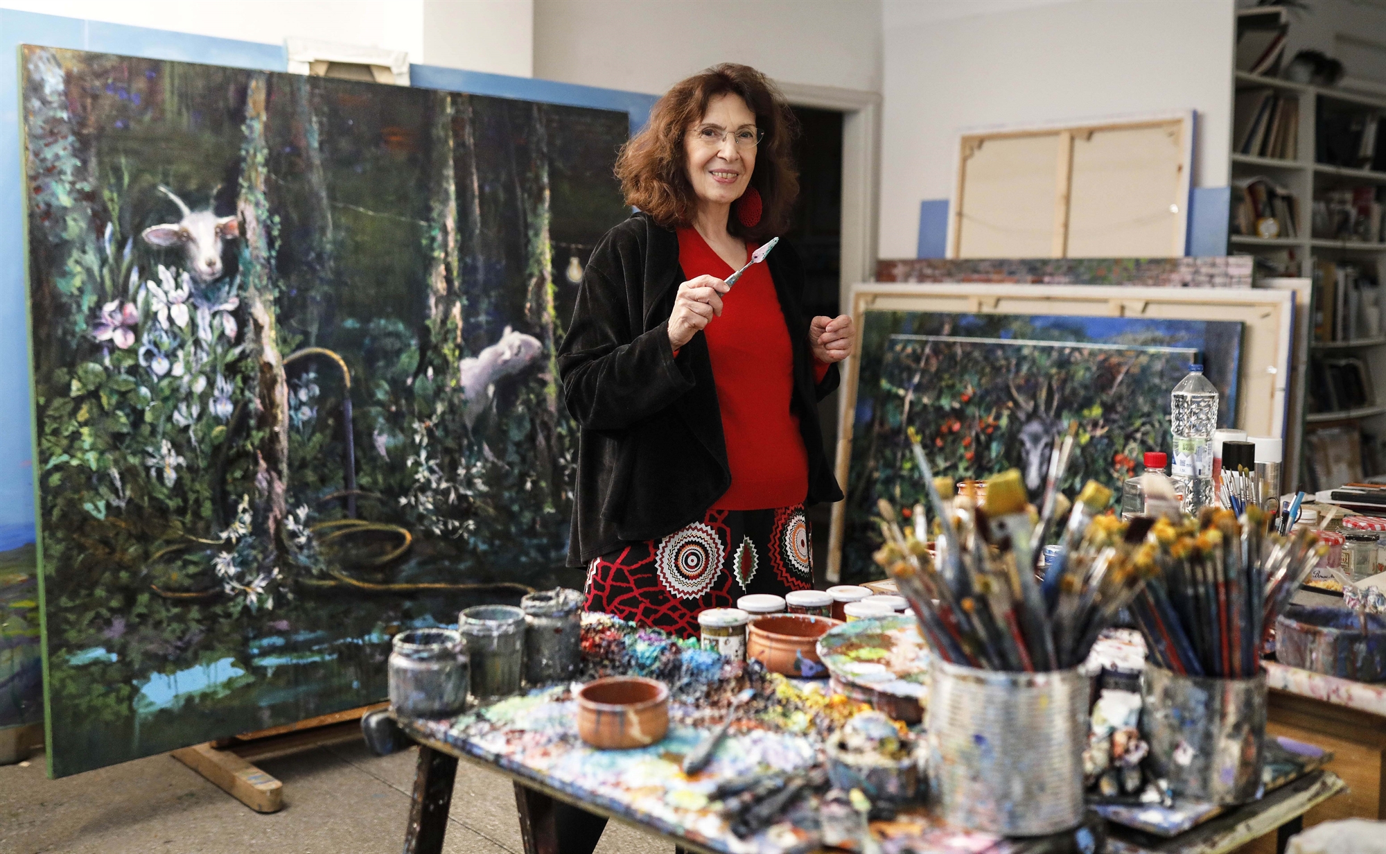 Eξω από το ατελιέ της Ειρήνης Ηλιοπούλου στον περιφερειακό του Λυκαβηττού, η πόλη αγκομαχάει μποτιλιαρισμένη. Ομως μέσα μοιραζόμαστε μια φύση που θάλλει στα λιβάδια και τα αγροκτήματα, την Εδέμ που γεννήθηκε στη φαντασία της ζωγράφου.
