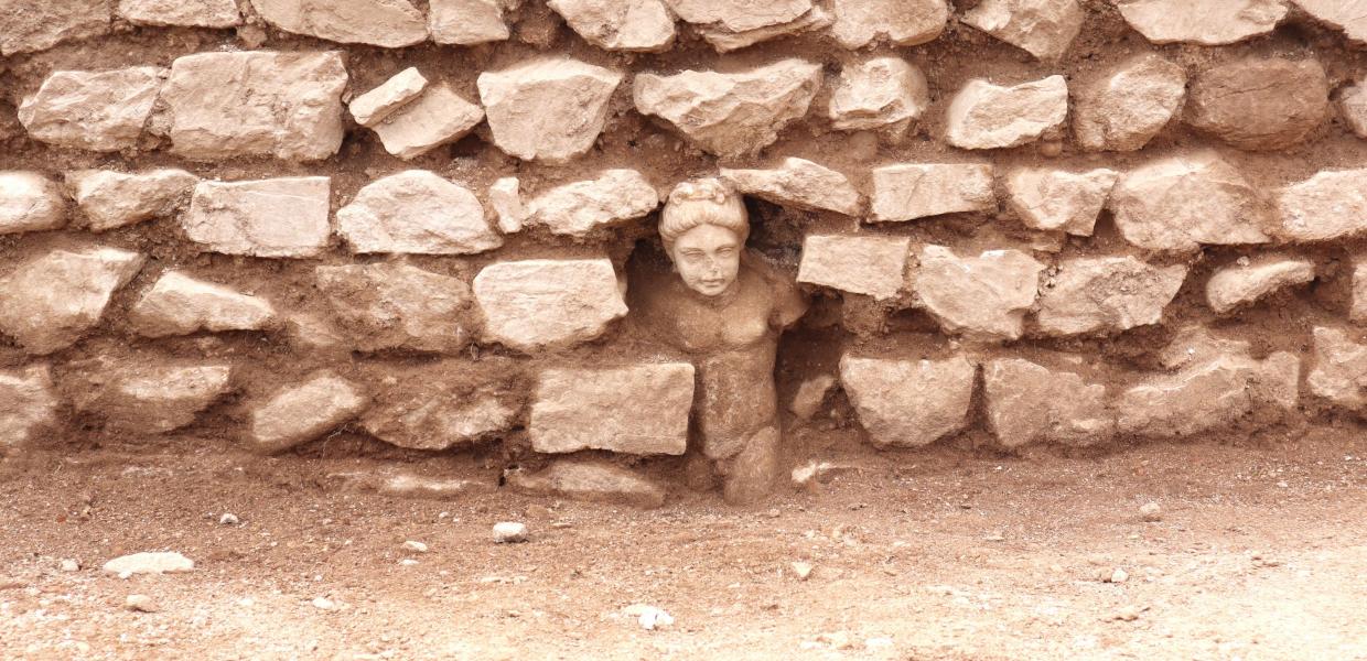 Το μεγάλων διαστάσεων κτίριο βρέθηκε κοντά στο αρχαίο θέατρο της πόλης. Στη βόρεια πλευρά του ήταν εντοιχισμένο το άνω τμήμα του κορμού ενός αγαλματιδίου νεαρού άνδρα. Το γλυπτό ύψους περίπου 60 εκατοστών, πιθανότατα ρωμαϊκών χρόνων, ενσωματώθηκε στην τοιχοποιία μεταγενέστερου κτιρίου – μια συνήθης πρακτική χρήσης αγαλμάτων ως οικοδομικού υλικού κατά την αρχαιότητα και στους μετέπειτα χρόνους.