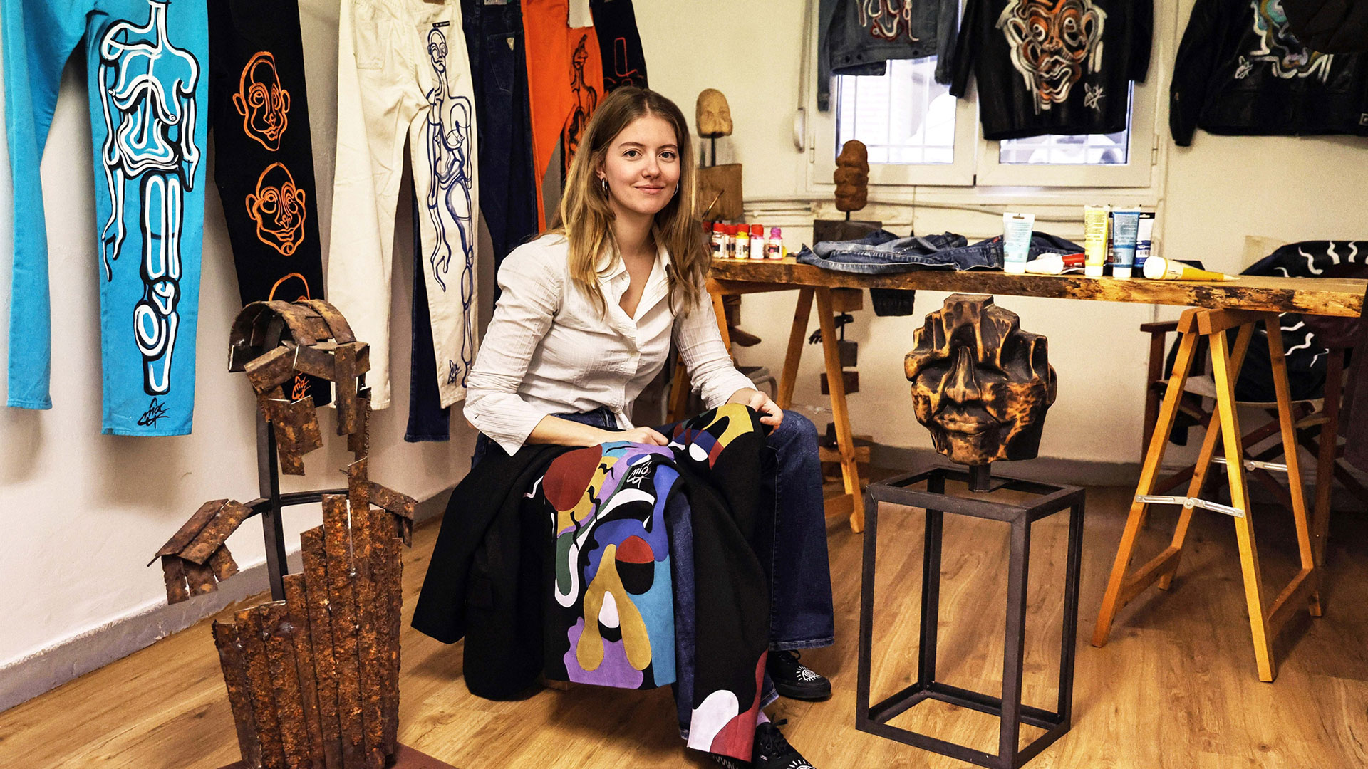 «Μόλις τελείωσα το σχολείο ξεκίνησα μαζί με έναν φίλο ένα μικρό brand, όπου μέσω σόσιαλ μίντια καλούσαμε κόσμο να μας φέρνει ρούχα τα οποία δεν φορούσε πια, για να τα ζωγραφίσουμε. Ετσι, αρχίσαμε να δίνουμε ζωή σε κάτι που θα πήγαινε στα σκουπίδια, και από μια αδιάφορη μπλούζα, για παράδειγμα, μεταμορφωνόταν σε ένα statement κομμάτι», μας λέει η κ. Αποστόλου και εξομολογείται ότι το αρχικό ερέθισμα προήλθε από τη μητέρα της, η οποία επίσης επενέβαινε ζωγραφικά πάνω σε υφάσματα.