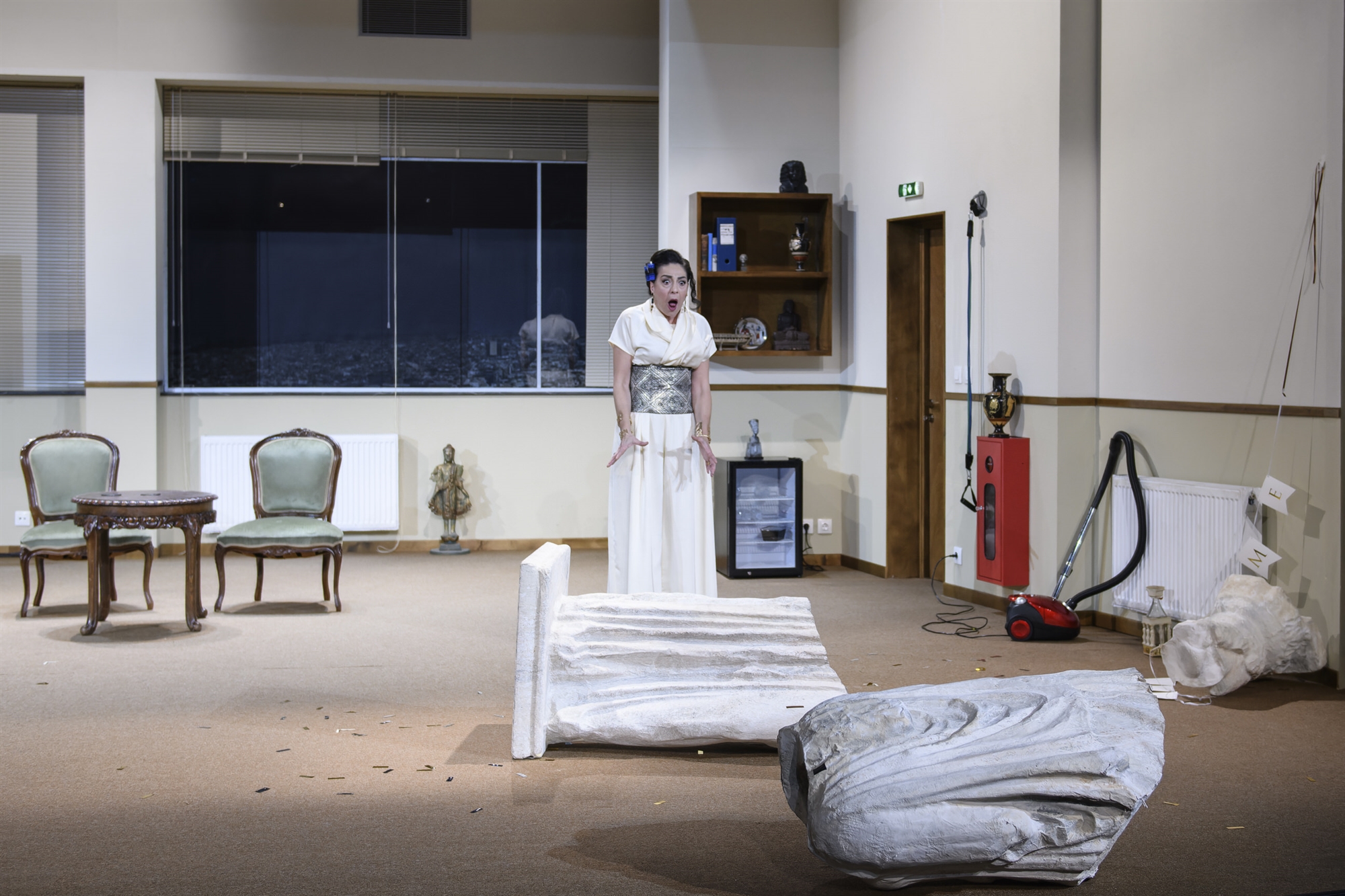 Ωραίο πράγμα ο αυτοσαρκασμός. Οταν αφορά μια ολόκληρη χώρα και τις καιροσκοπικές πτυχές του πολιτικού της συστήματος, αναδεικνύει ένα σωρό στραβά και ανάποδα γνωρίσματά τους, μέσα από ένα χιούμορ διεισδυτικό και σχεδόν παρηγορητικό. Που όχι μόνον αναδεικνύει την κωμική όψη προσώπων και πραγμάτων, αλλά και την προσπερνάει αισιόδοξα, υπονοώντας τη δυνατότητα καλύτερων επιλογών. Και ενώ δεν είναι βέβαιο ότι αυτό είχε κατά νουν ο Γιώργος Καπουτζίδης όταν έγραφε την κωμωδία «Η Καρυάτιδα!», που αυτές τις ημέρες παίζεται στο Εθνικό Θέατρο, το έργο, στην αρχή τουλάχιστον, προκαλεί αβίαστα το γέλιο, μαζί με κάποιες σκέψεις για το πώς διαχειριζόμαστε την πολιτιστική μας κληρονομιά, όταν μάλιστα αυτή βρίσκεται όντως στα χέρια μας. Η «Καρυάτιδα!» δηλαδή, με αυτό το παιχνιδιάρικο θαυμαστικό στον τίτλο, μοιάζει ίσως να μας προειδοποιεί για όσα μπορεί να ακούσουν τα αυτάκια μας εάν επιστρέψουν τα Γλυπτά του Παρθενώνα.