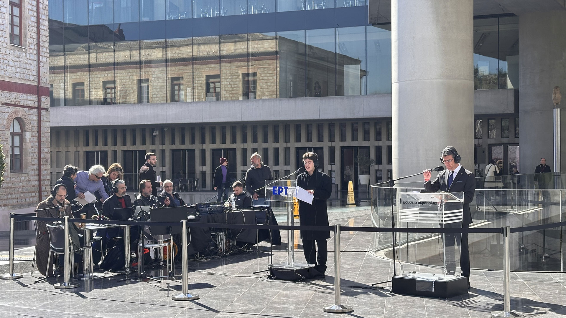 Πολύ νωρίς χθες το πρωί, 13 φοιτητές της κλασικής φιλολογίας του Πανεπιστημίου Αθηνών συναντήθηκαν στον αύλειο χώρο του Μουσείου Ακρόπολης. Ο ένας μετά τον άλλον έβαζαν τα ακουστικά που τους έδινε η παραγωγή του Τρίτου Προγράμματος της ΕΡΤ και περνούσαν, κάπως διστακτικά, μπροστά από ένα μικρόφωνο που είχε στηθεί μπροστά σε ένα υπαίθριο ραδιοφωνικό στούντιο.