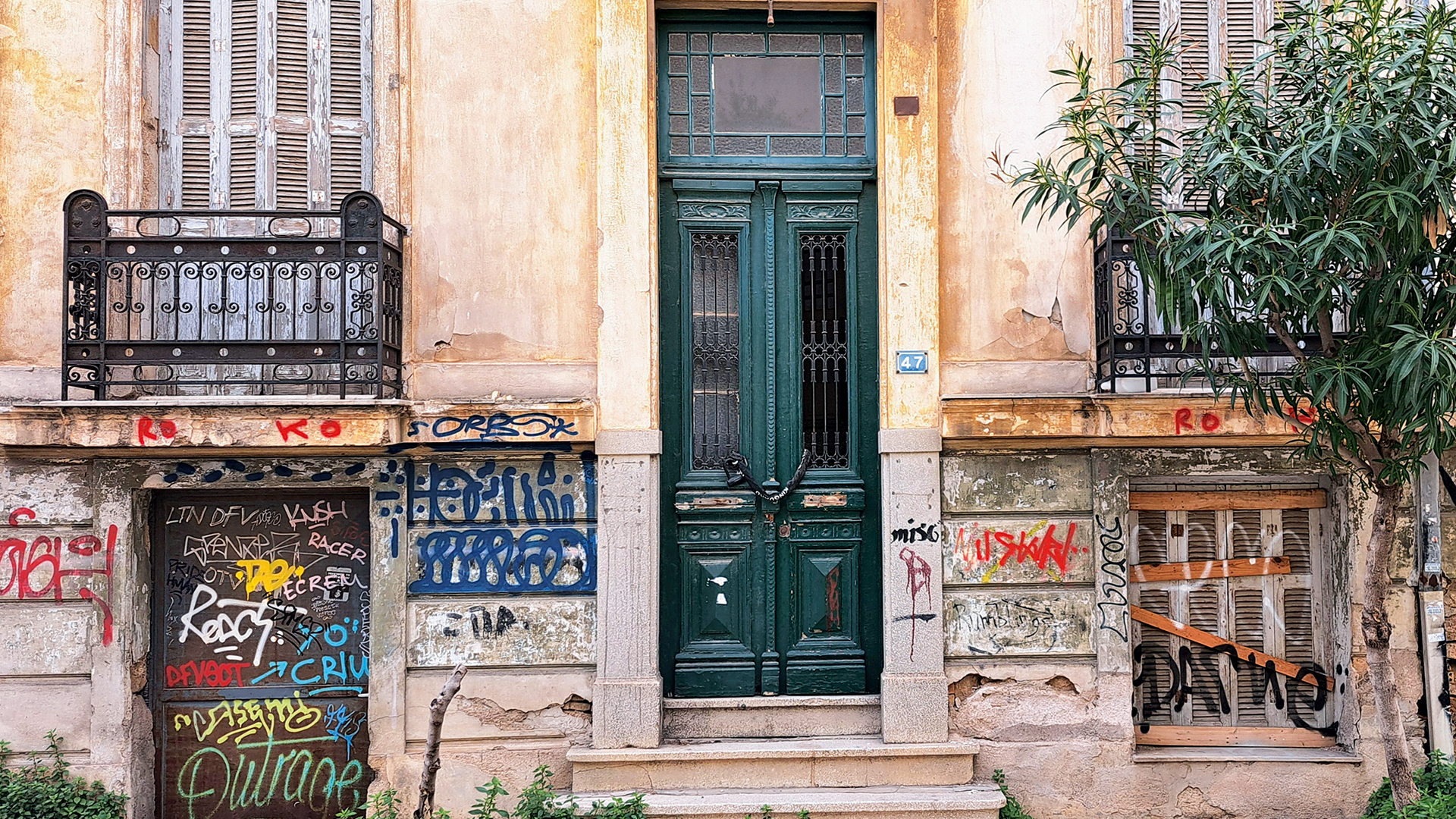 Αυτό εδώ μπροστά μου ήταν ένα σπίτι για μεσοαστούς. Από το άνοιγμα της επιβλητικής πράσινης ξυλόγλυπτης εξώθυρας (με λεηλατημένα τα ρόπτρα, με κλειδωνιά-θηλιά στις σιδεριές του φεγγίτη), μπορεί να δει κανείς ανενόχλητος το εσωτερικό. Στο δάπεδο αχνοφαίνονται τα πλακάκια, ρόδακες τετράφυλλοι σε χρώμα βερικοκί μέσα σε μαύρο κύκλο που σχηματίζει νευρώνες στο λευκό φόντο. Τα περισσότερα από τα πλακάκια είναι ραγισμένα. Θα διασωθούν άραγε κάποια από αυτά; Τα σκαλοπάτια της εισόδου οδηγούν στον προθάλαμο. Αριστερά και δεξιά οι χώροι υποδοχής. Στο βάθος η δίφυλλη κρεμ πόρτα με τα καΐτια στέκει μισάνοιχτη και μας επιτρέπει να δούμε την πίσω μπαλκονόπορτα της κάμαρας στο βάθος που βγάζει στην αυλή.