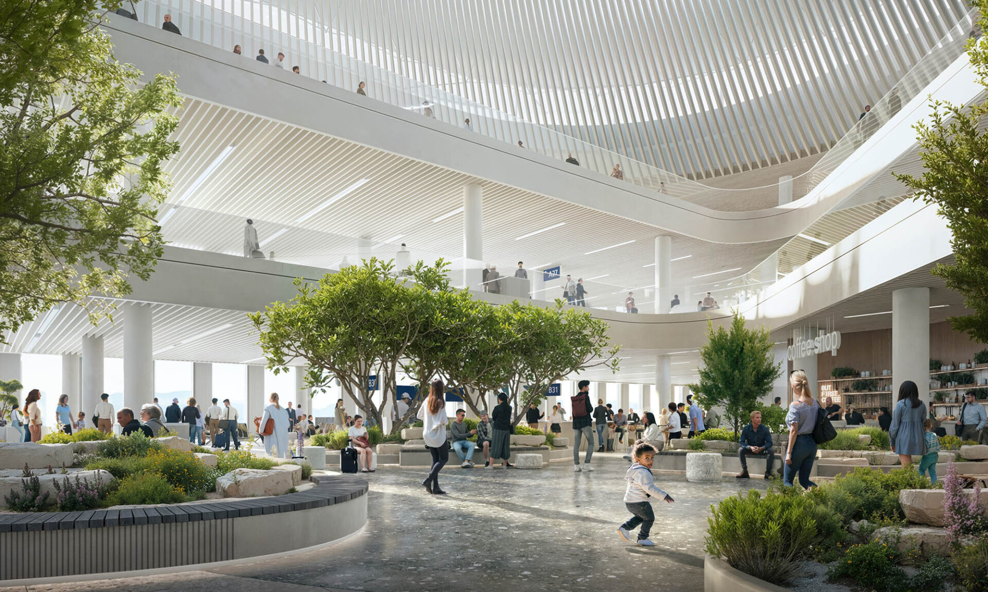 «Η ανθρώπινη κλίμακα είναι πολύ έντονη στην Αθήνα και η κοινωνικοποίηση γίνεται μέσα από τις πλατείες και τους πεζοδρόμους. Προσπαθήσαμε να φέρουμε αυτή την αίσθηση μέσα στο αεροδρόμιο, δημιουργώντας δύο πλατείες, δύο σημεία στίξης στους δύο μεγάλους χώρους της επέκτασης. Στο ένα από τα δύο σημεία θα κατασκευαστεί και ένα αμφιθέατρο για να ξεφύγουμε από τον formal τρόπο καθίσματος, όπως συμβαίνει και στις πλατείες», σημειώνει ο κ. Καραμπατάκης. Στις δύο «πλατείες», στη βόρεια και νότια πλευρά του αερολιμένα, θα υπάρχει φύτευση με δέντρα και φυτά που θα συναντήσει ο επισκέπτης στην Αθήνα, ενώ ο φυσικός φωτισμός θα λειτουργήσει ευεργετικά τόσο για την ανάπτυξή τους όσο και για τη μείωση του ενεργειακού αποτυπώματος του αεροδρομίου.